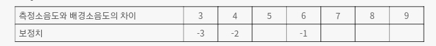 4. 측정소음도와 배경소음도의 차이가 3~9dB이면 아래의 보정치를 보정한 후 대상소음도를 구하고, 그 차이가 2dB 이하인 경우에는 다시 두 번 측정하여 측정소음도를 구하며, 다시 두 번 측정하여 측정소음도를 구하여도 그 차이가 2dB 이하인 경우에는 확성기등의 소음으로 보지 아니한다.