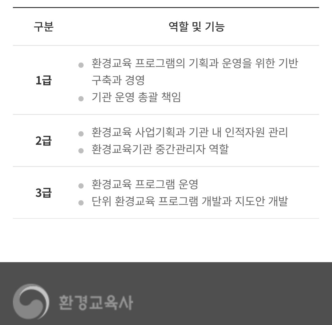 환경교육사는 3개 등급으로 구분되며, 1급은 환경교육기관 책임자 (기반 구축·경영), 2급은 중간관리자 (기획·운영관리), 3급은 강사·해설가 (교육수행·해설) 역할을 수행합니다.