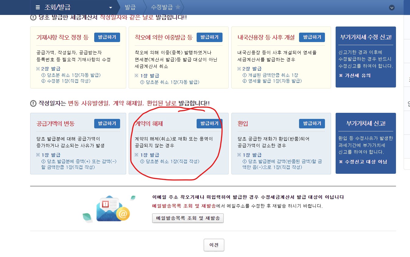 세금계산서 취소는 계약의 해제에 해당되니까 계약의 해제에서 파란색 발급하기를 눌러 줍니다.