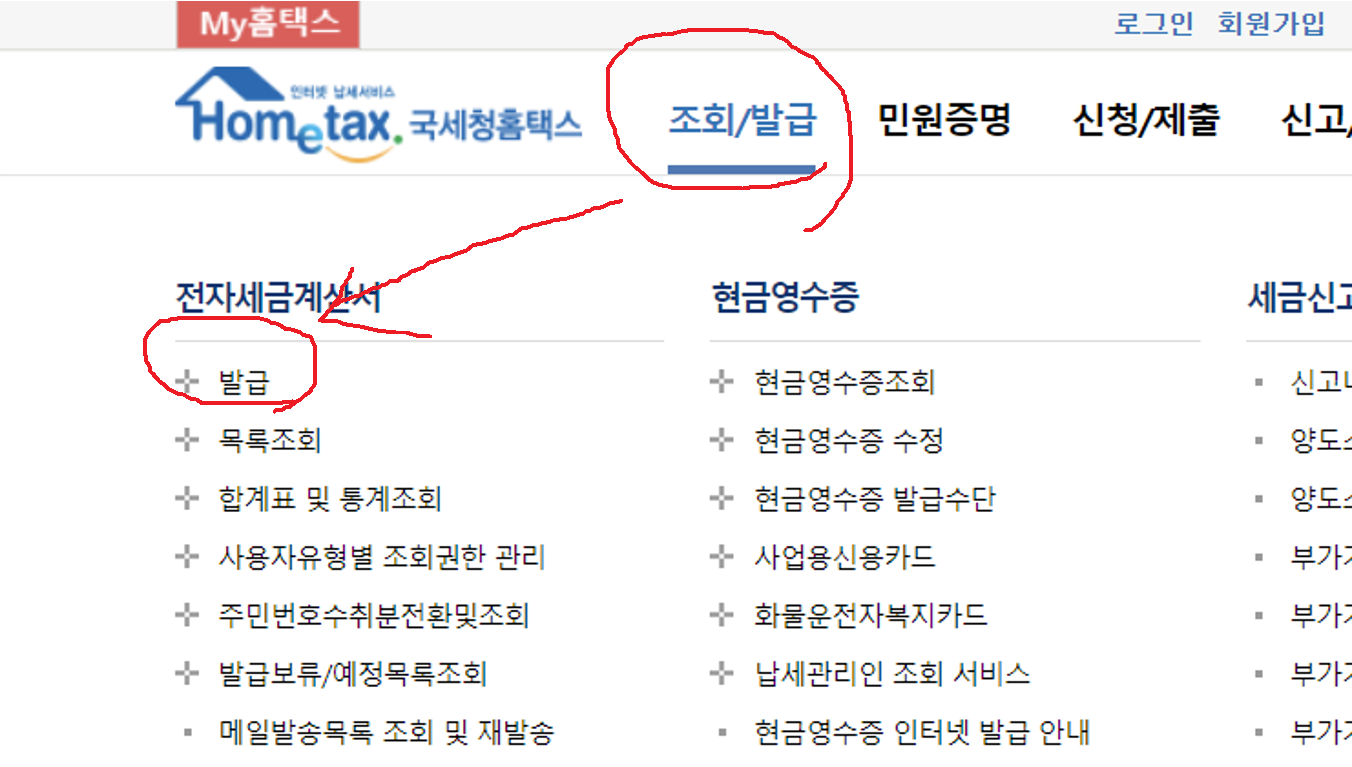오른쪽 별표 해놓은 부분의 <세금계산서 조회하기>를 누르겠습니다.