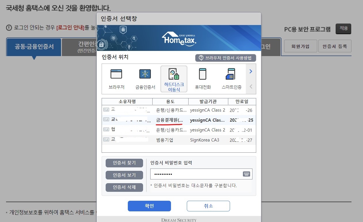 발급할때 해보셔서 아시겠지만 금융결재원 공인인증서를 사용합니다.