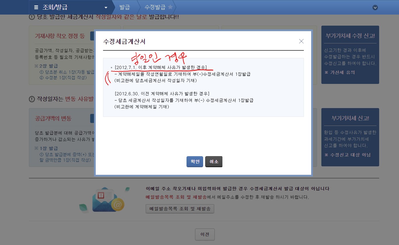 사실 확인을 누르면 알아서 마이너스( ㅡ ) 세금계산서가 작성된 상태로 뜨니 부담 갖지마시고 확인을 클릭하면 됩니다.