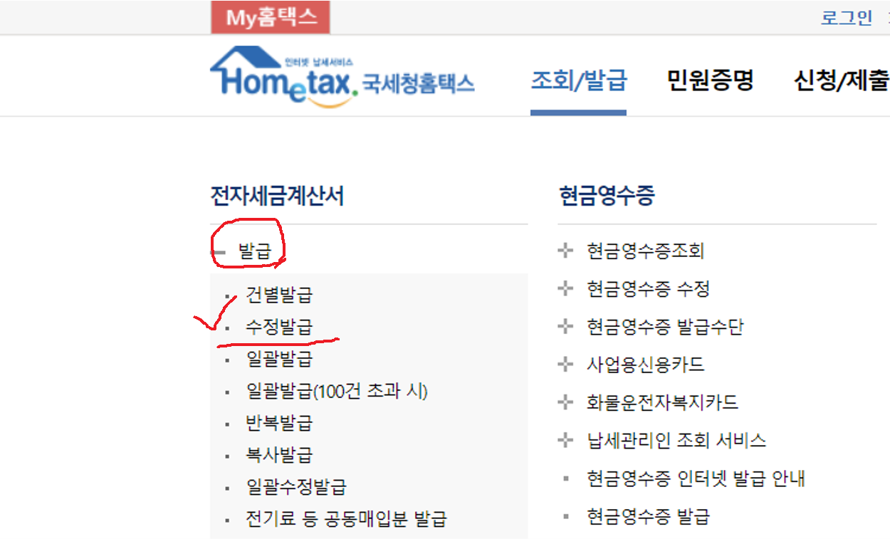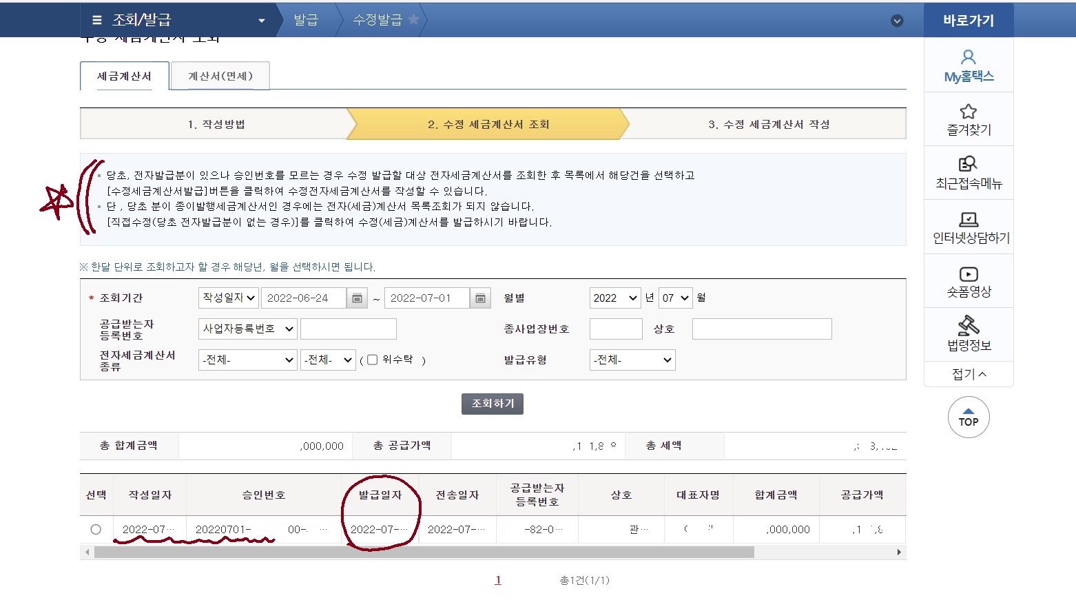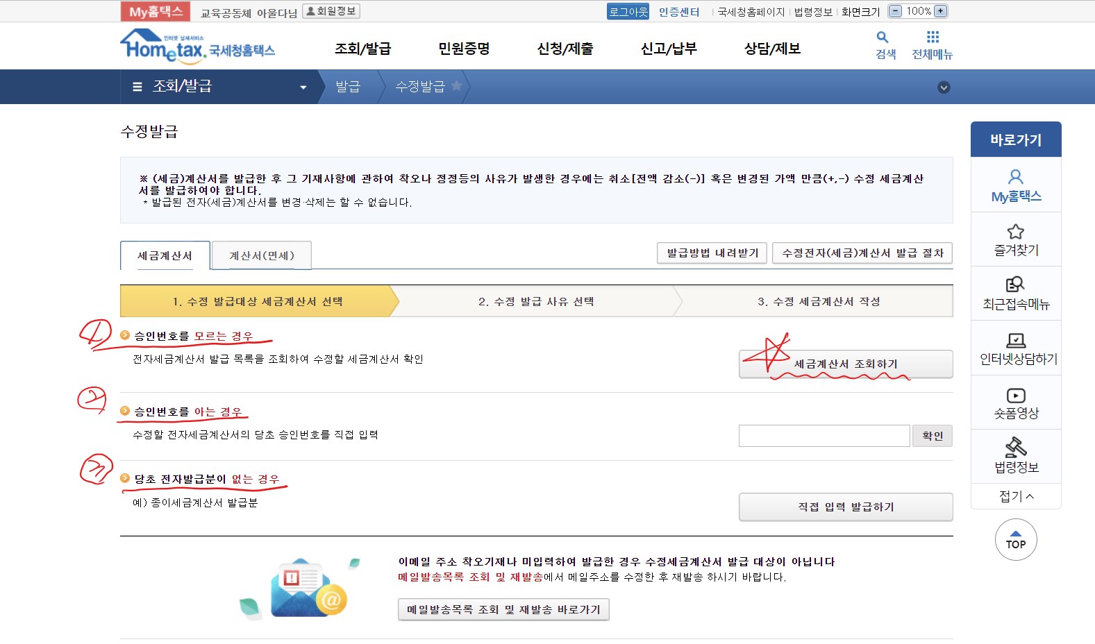 오늘 방금 전 발행한 <<전자세금계산서를 취소하려는 경우>> 홈택스 홈페이지의 조회/발급에서