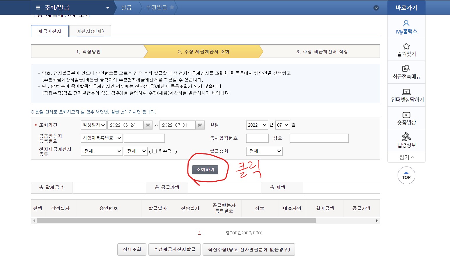 세금계산서 조회하기로 들어가면 그 어떤 항목도 나오지 않는데요, 이때 아래에 있는 <조회하기>를 클릭 합니다.