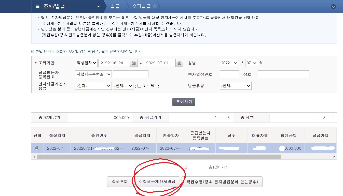 오늘 발행한 전자세금계산서 왼쪽 앞의 동그라미를 클릭하면 아래에 다음 항목들이 나타나는데요, 거기서 중간 <수정 세금계산서 발급>을 클릭합니다.