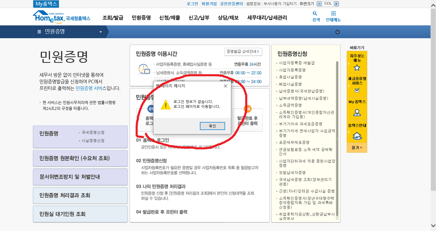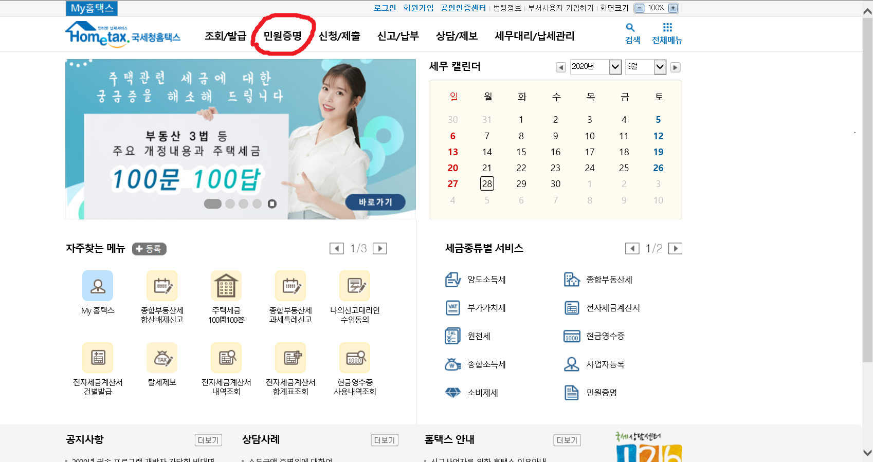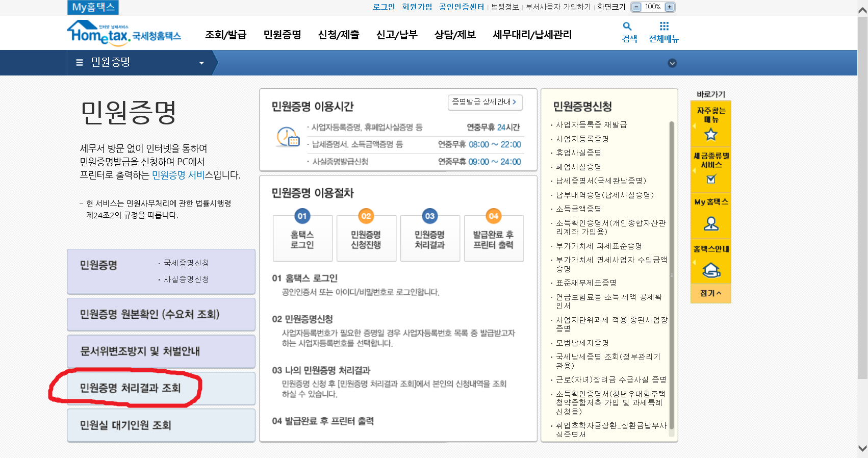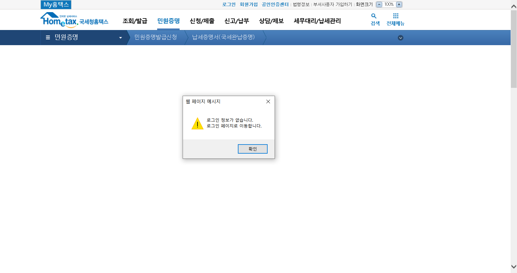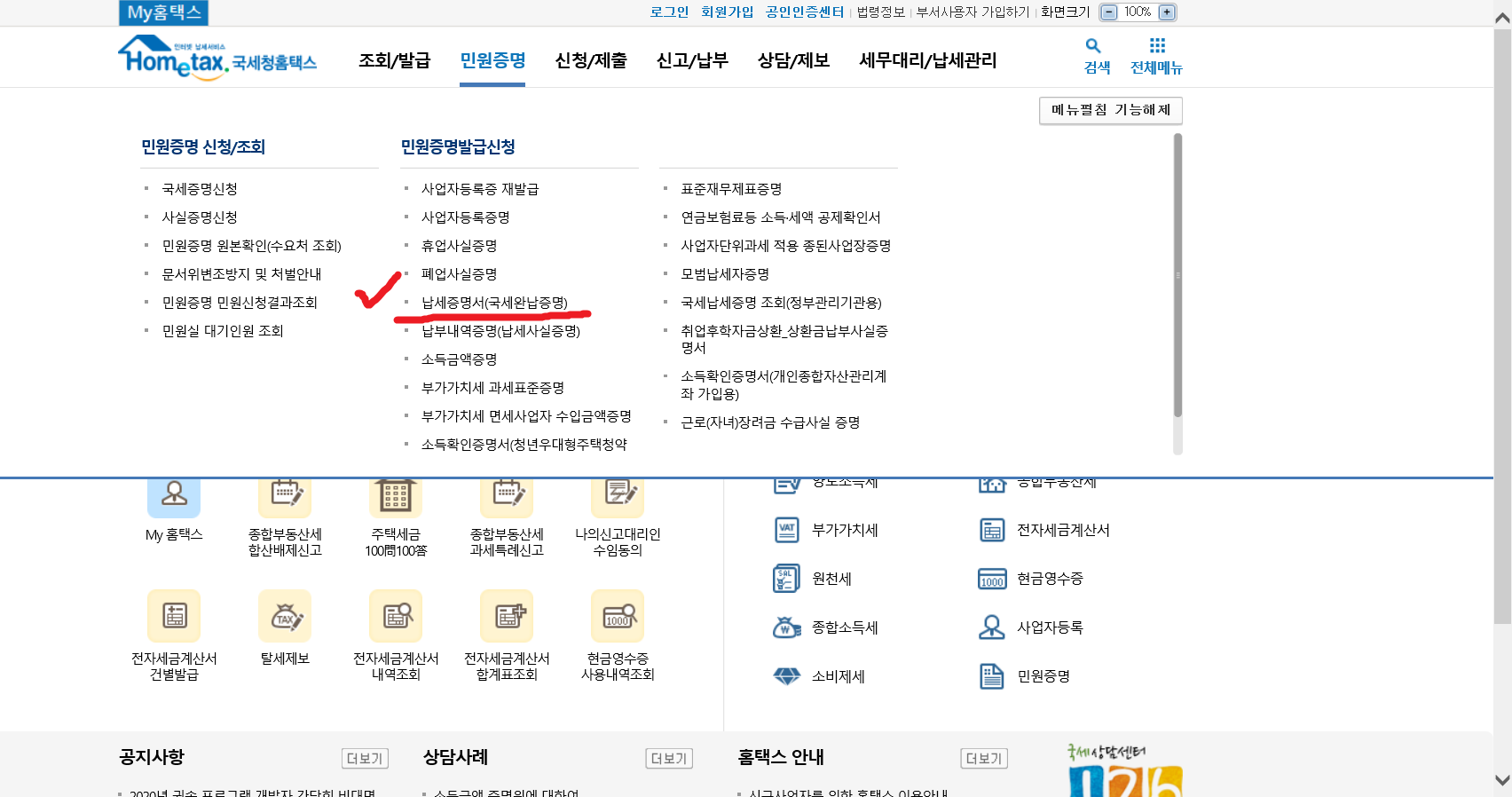 2. 국세청 홈택스를 들어가서 <민원증명>을 클릭합니다.