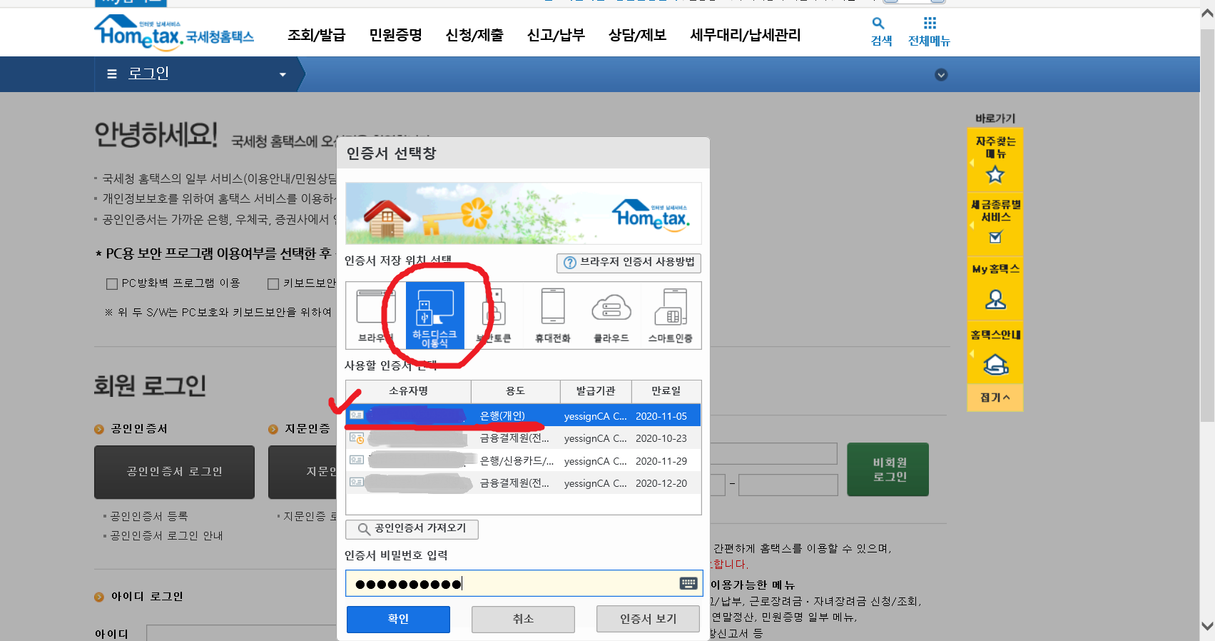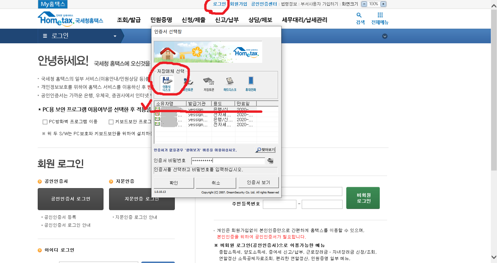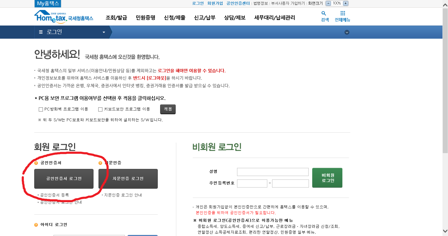 5. 로그인을 위해 <공인인증서 로그인>을 선택합니다.