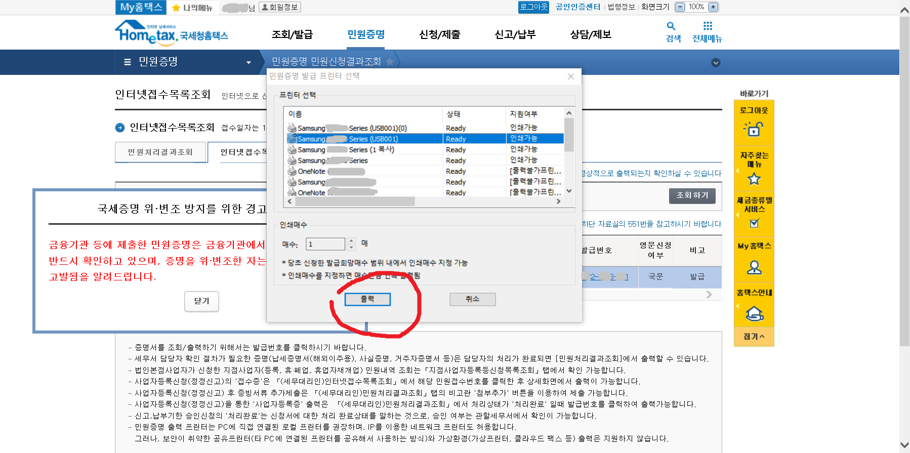 10. 증명서를 발급받았으니 <출력>을 해보겠는데요, 이때 <발급번호>를 눌러주면 됩니다.