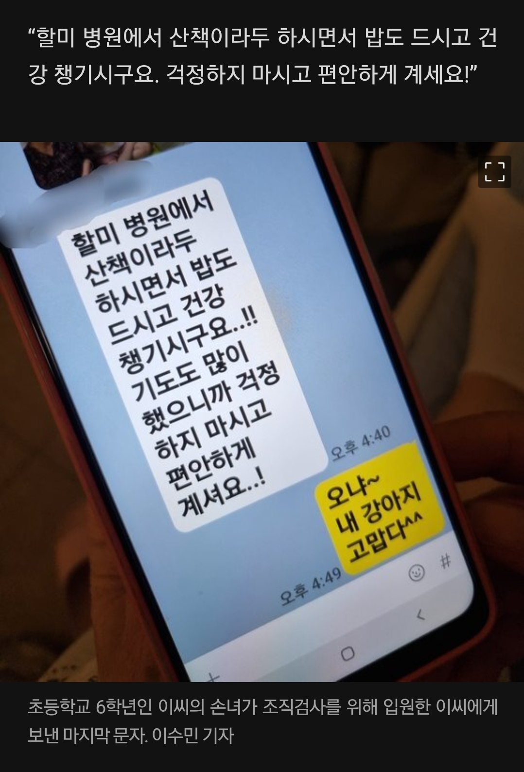 “할미 병원에서 산책이라두 하시면서 밥도 드시고 건강 챙기시구요. 걱정하지 마시고 편안하게 계세요!” 지난 8일 오후 기록적 폭우에 서울 관악구 신림동 반지하 주택에서 참변을 당한 A양(13