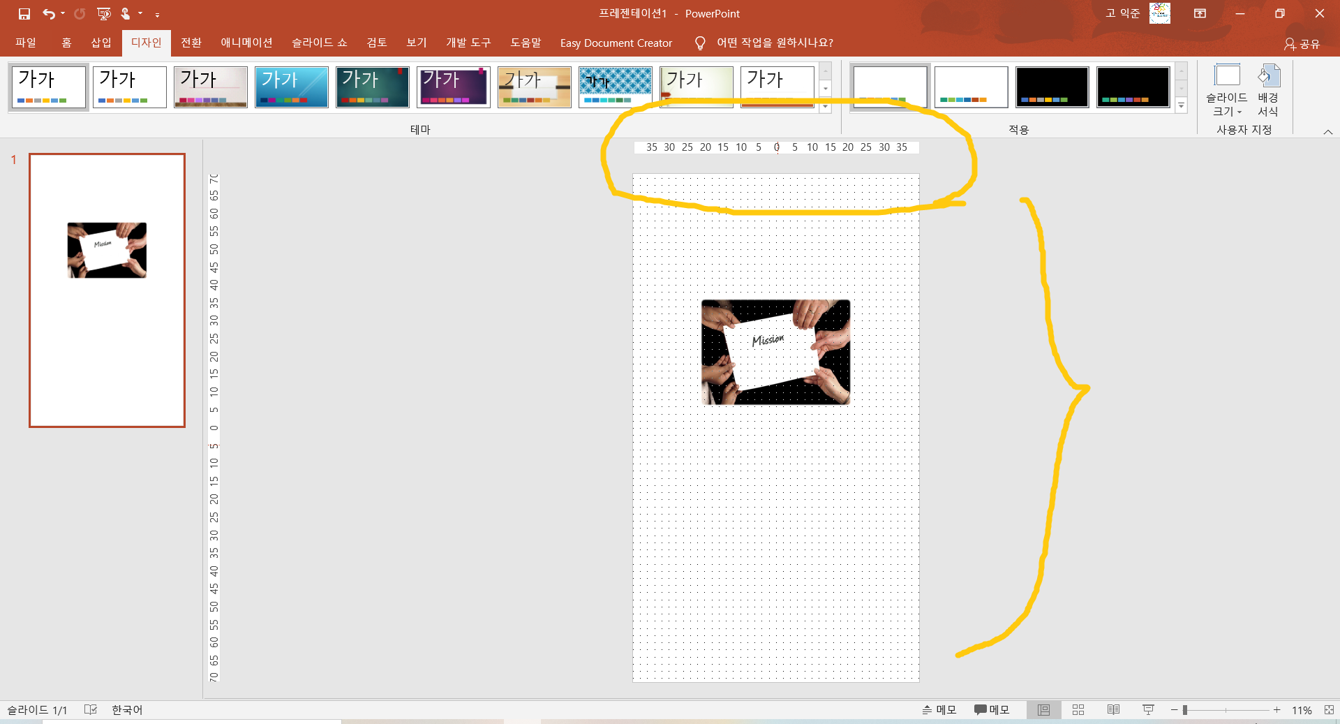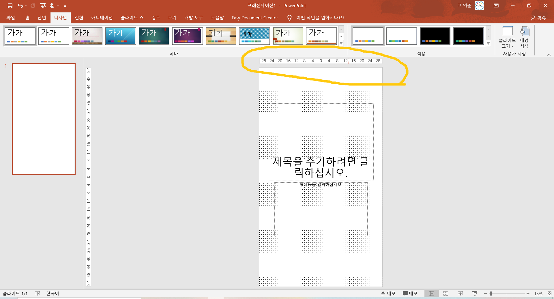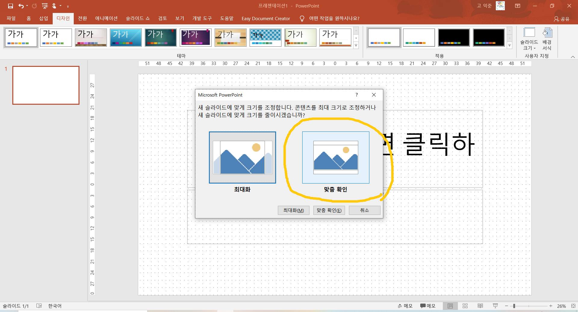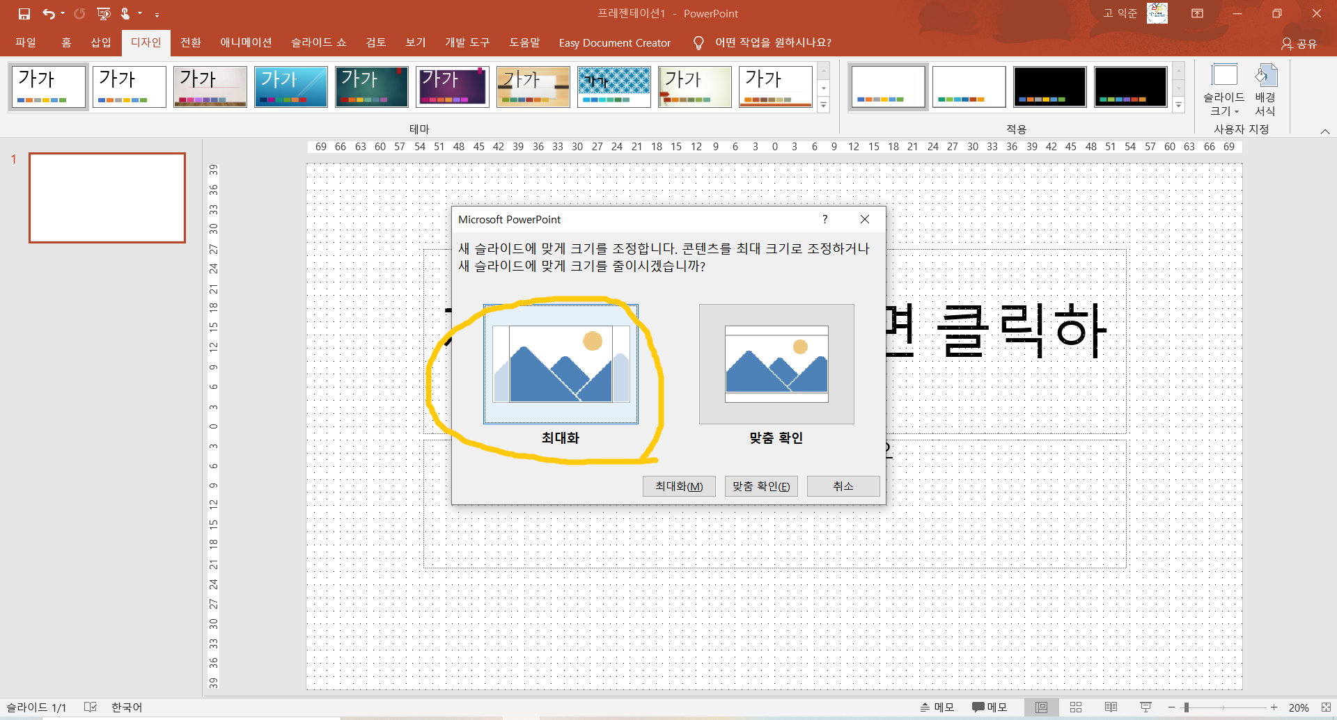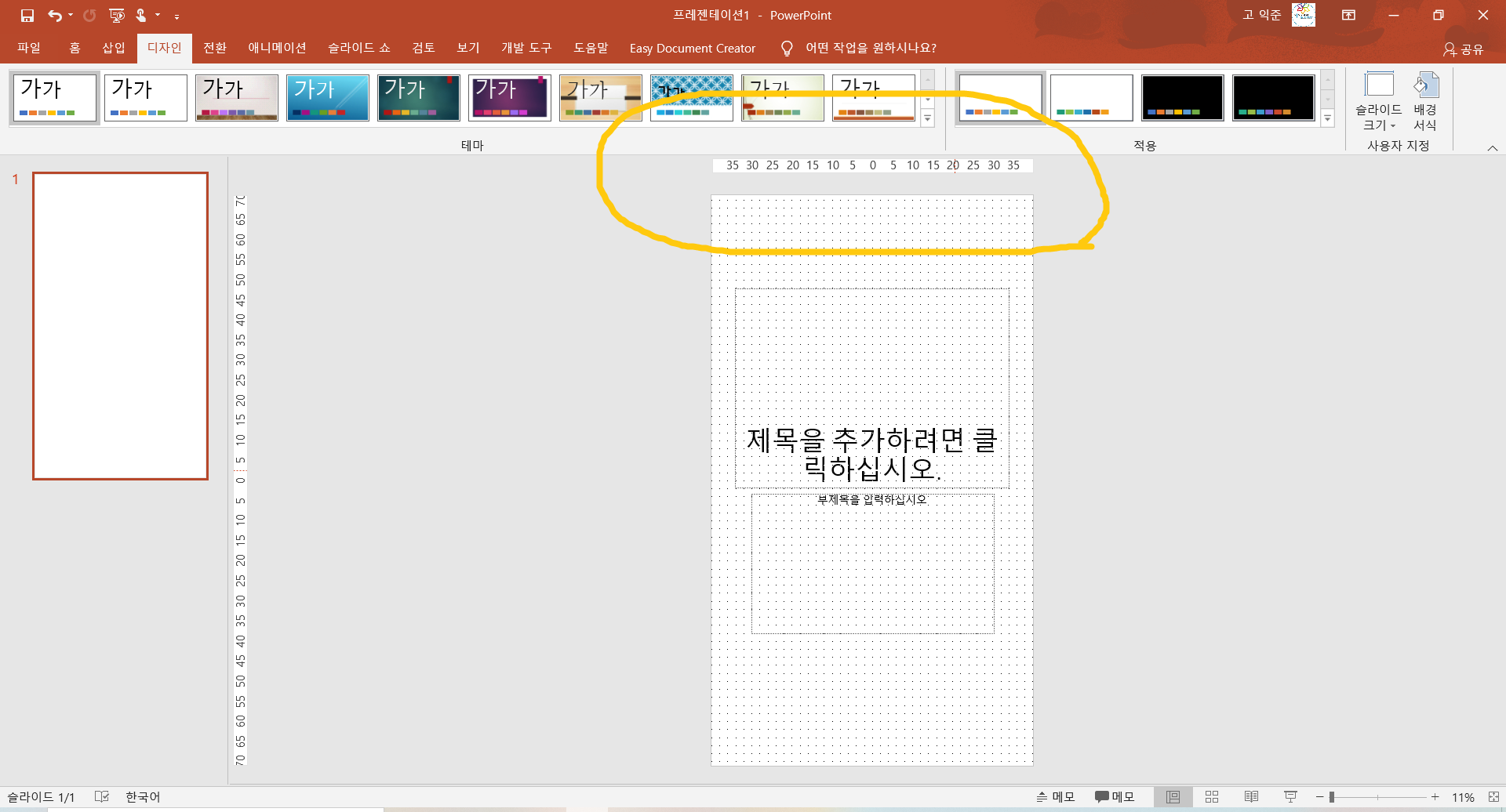 3. 디자인 화면 오른쪽 끝으로 가면 《슬라이드 크기》가 보이는데 여기를 클릭합니다.