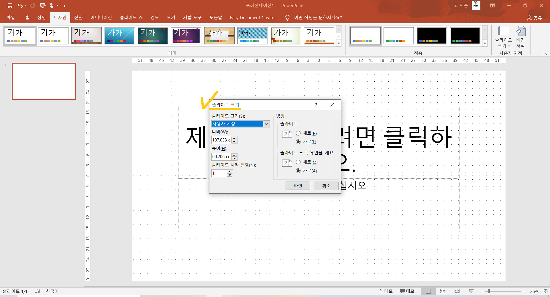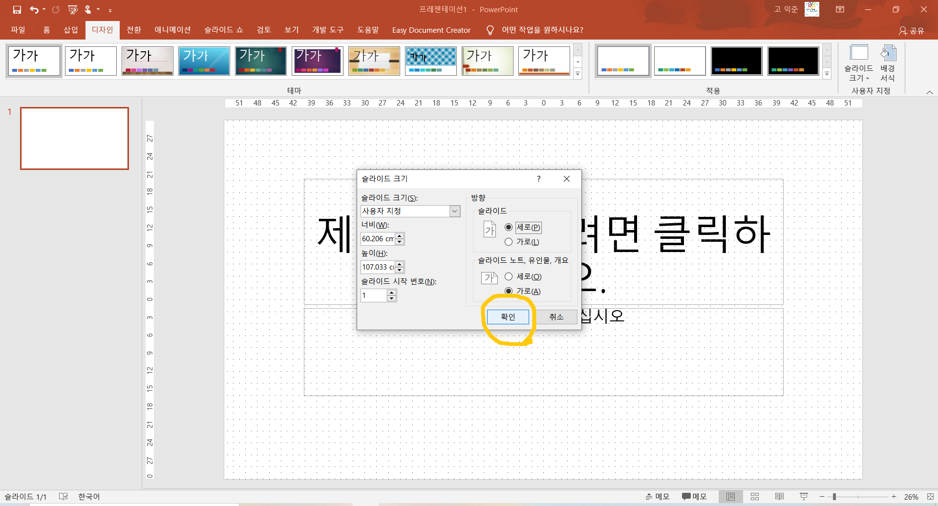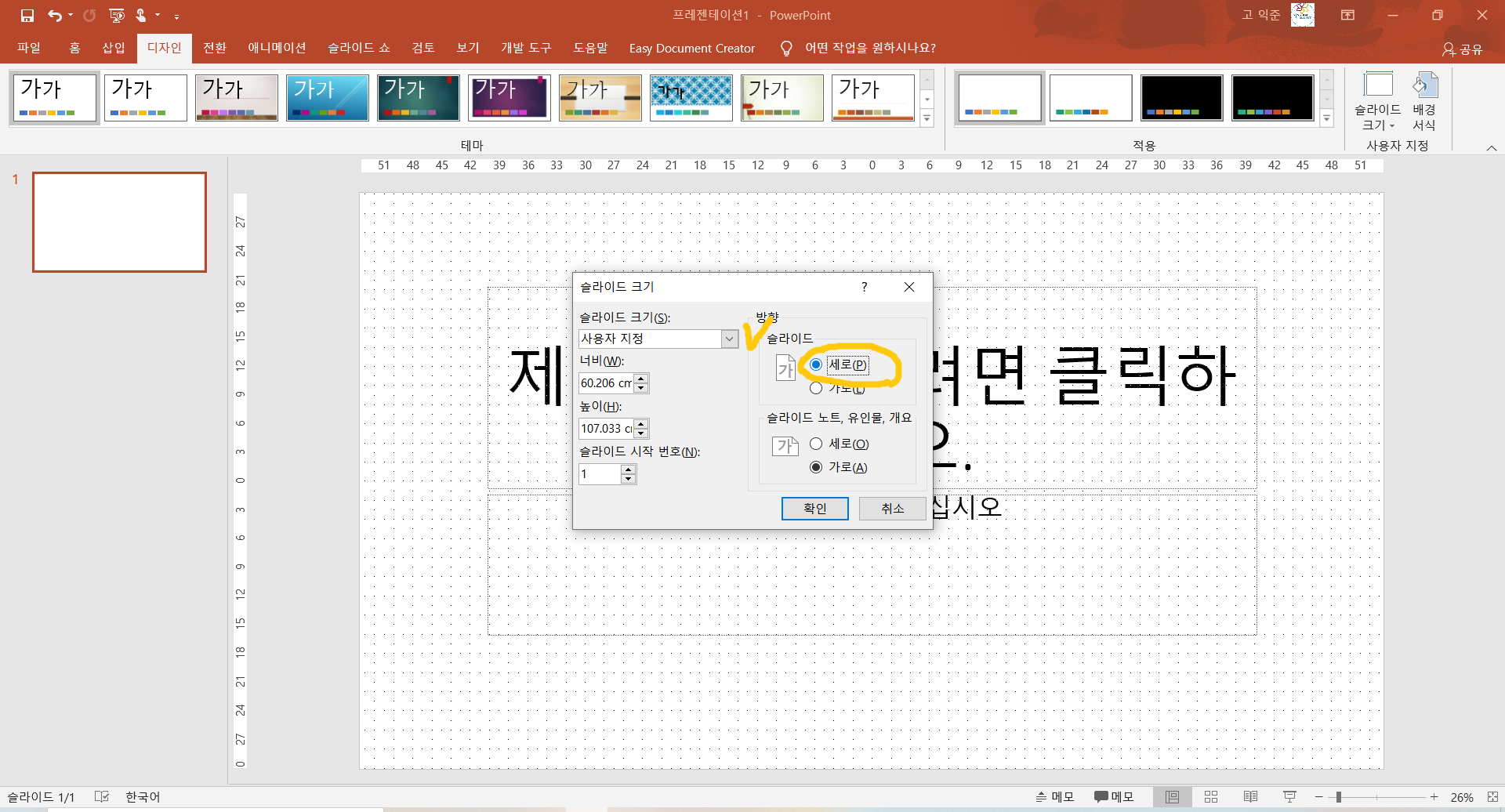 5. 그러면 《새로운 창》이 똭~ 등장합니다. 당황하지말고 새화면 《오른쪽에 있는 슬라이드에서 세로를 클릭》하고 확인을 눌러 줍니다.