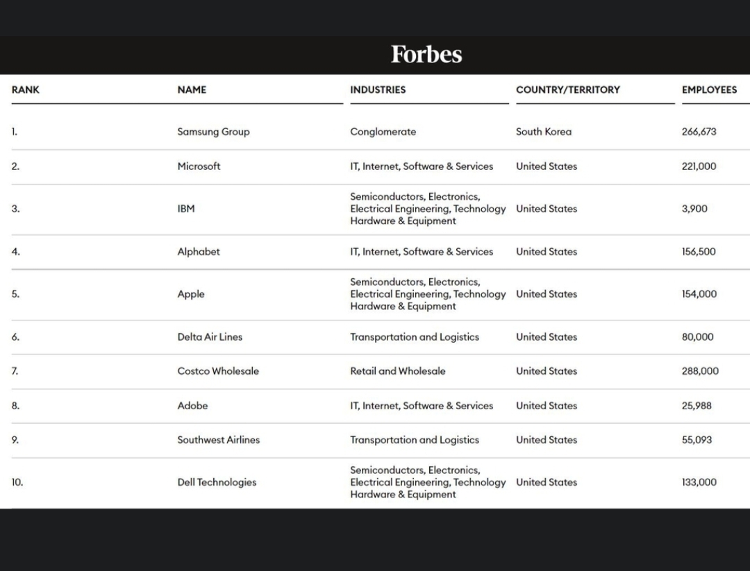 11일(현지시간) 미국 경제지 포브스가 발표한 '세계 최고의 직장' 평가에서 삼성전자가 3년 연속 1위를 차지했다고 밝혔다.