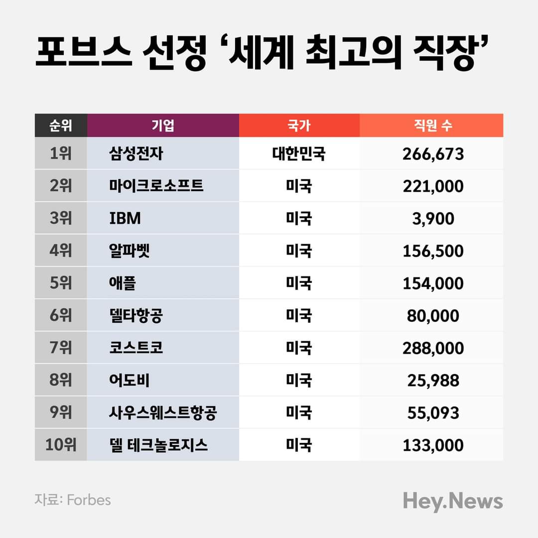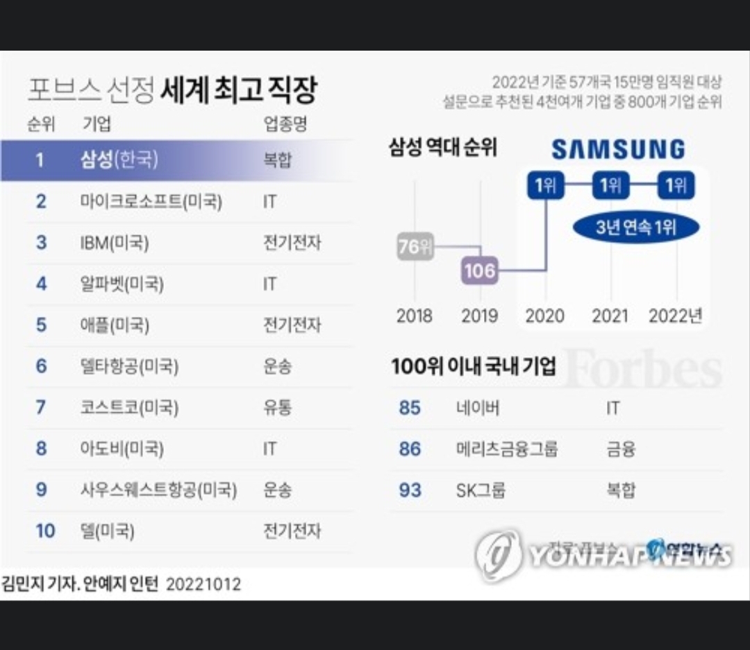 삼성전자, 3년 연속 포브스 선정 '세계 최고의 직장' 1위 2022.10.12