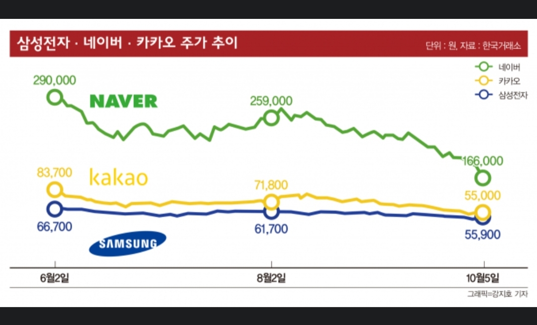 국민株 삼성전자·네이버·카카오 신저가 추락.. 개미는 '피눈물'