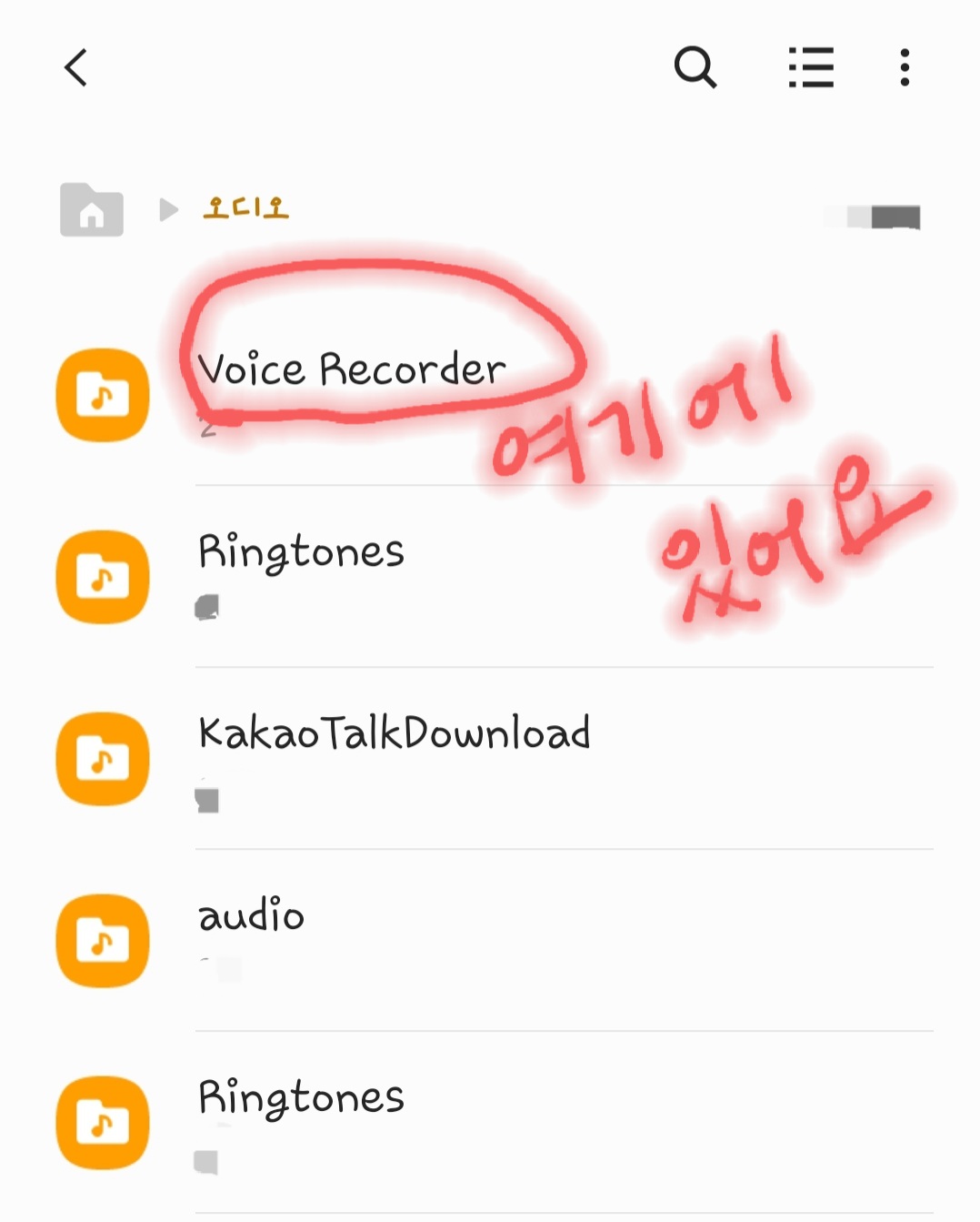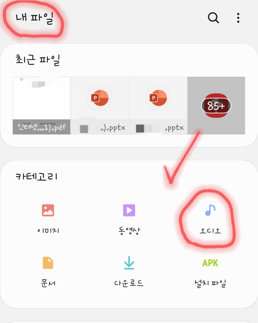 8. 내 파일로 가면 다음 화면이 나타나는데, 《오디오》를 클릭합니다.