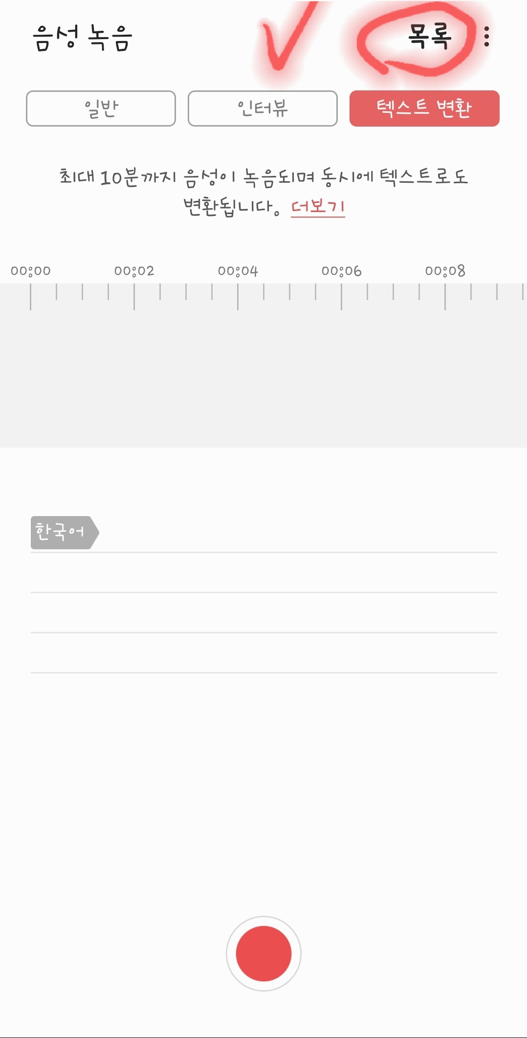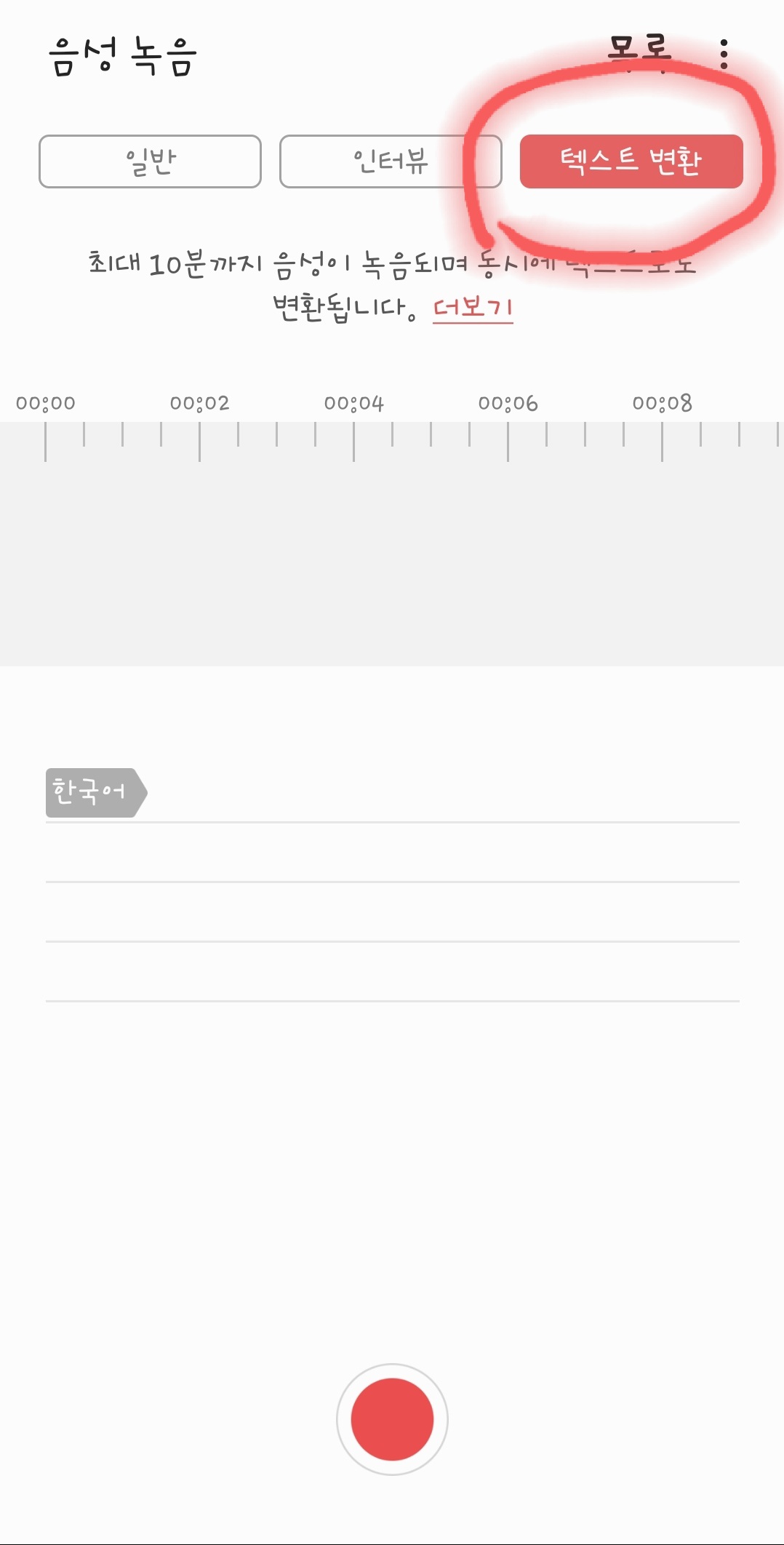 3. 《텍스트 변환이 선택》된 상황에서 《녹음》버튼을 누르면 아래에 《한글로 변환》되는게 보이실 겁니다.