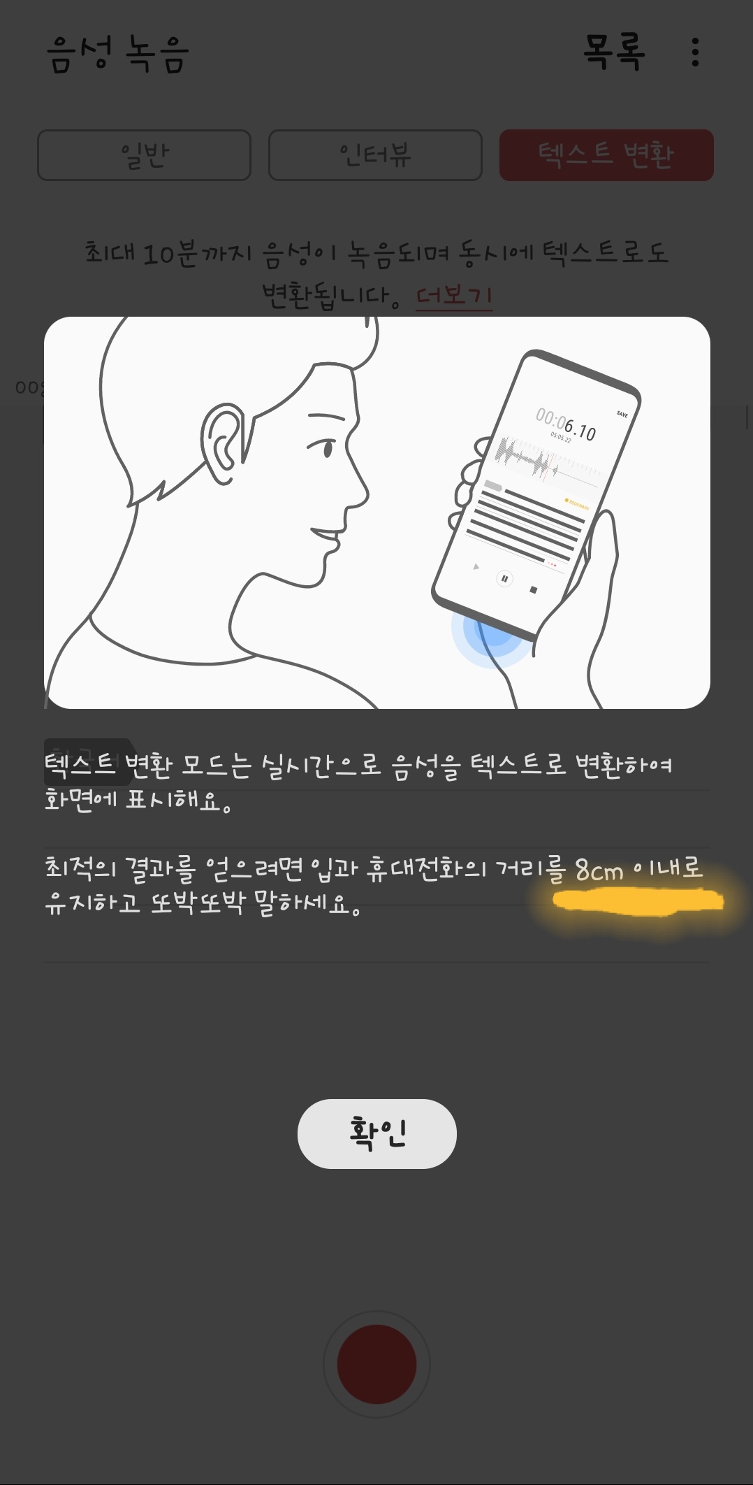 2. 여기서 《더보기》를 눌러보면 사용법이 나오는데요. 《8cm 이내》로 가까이서 말할 때 효과적이다라는 얘기입니다. 다시 앞으로 가려면 확인을 누르시고요.