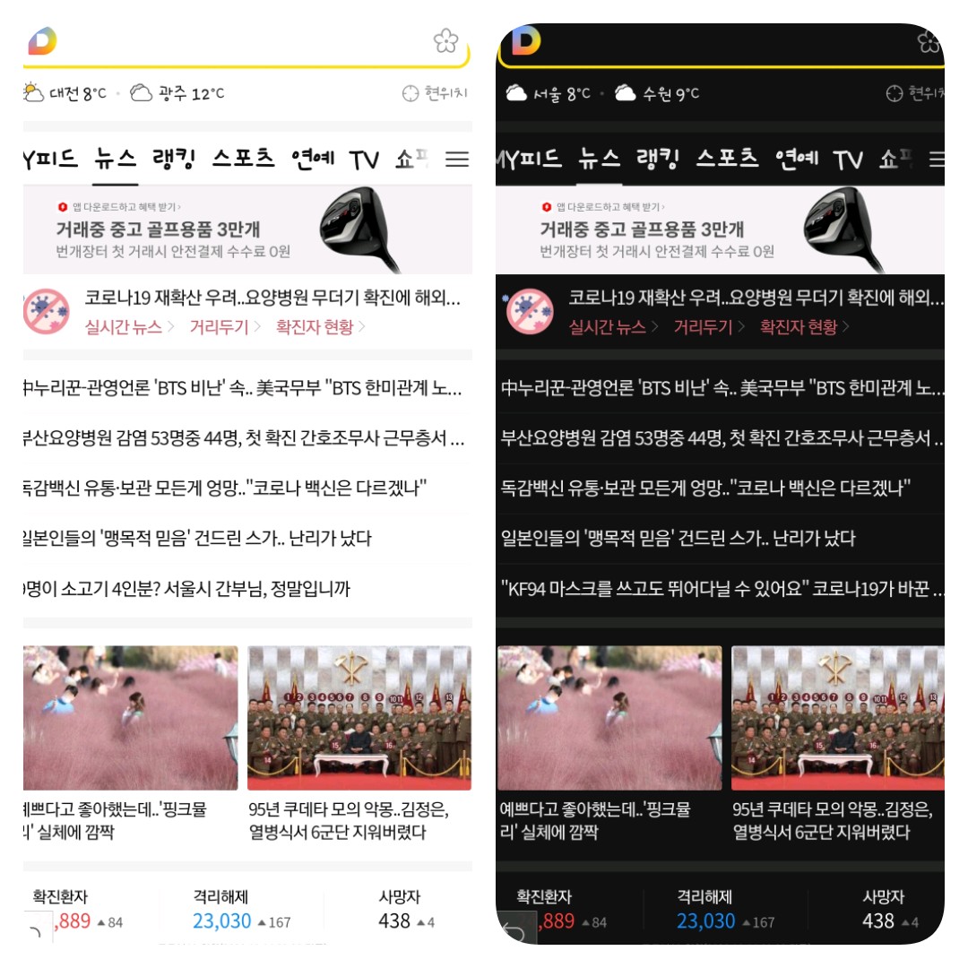 똑같은 다음 메인화면인데 왼쪽은 화이트, 오른쪽은 블랙🤔