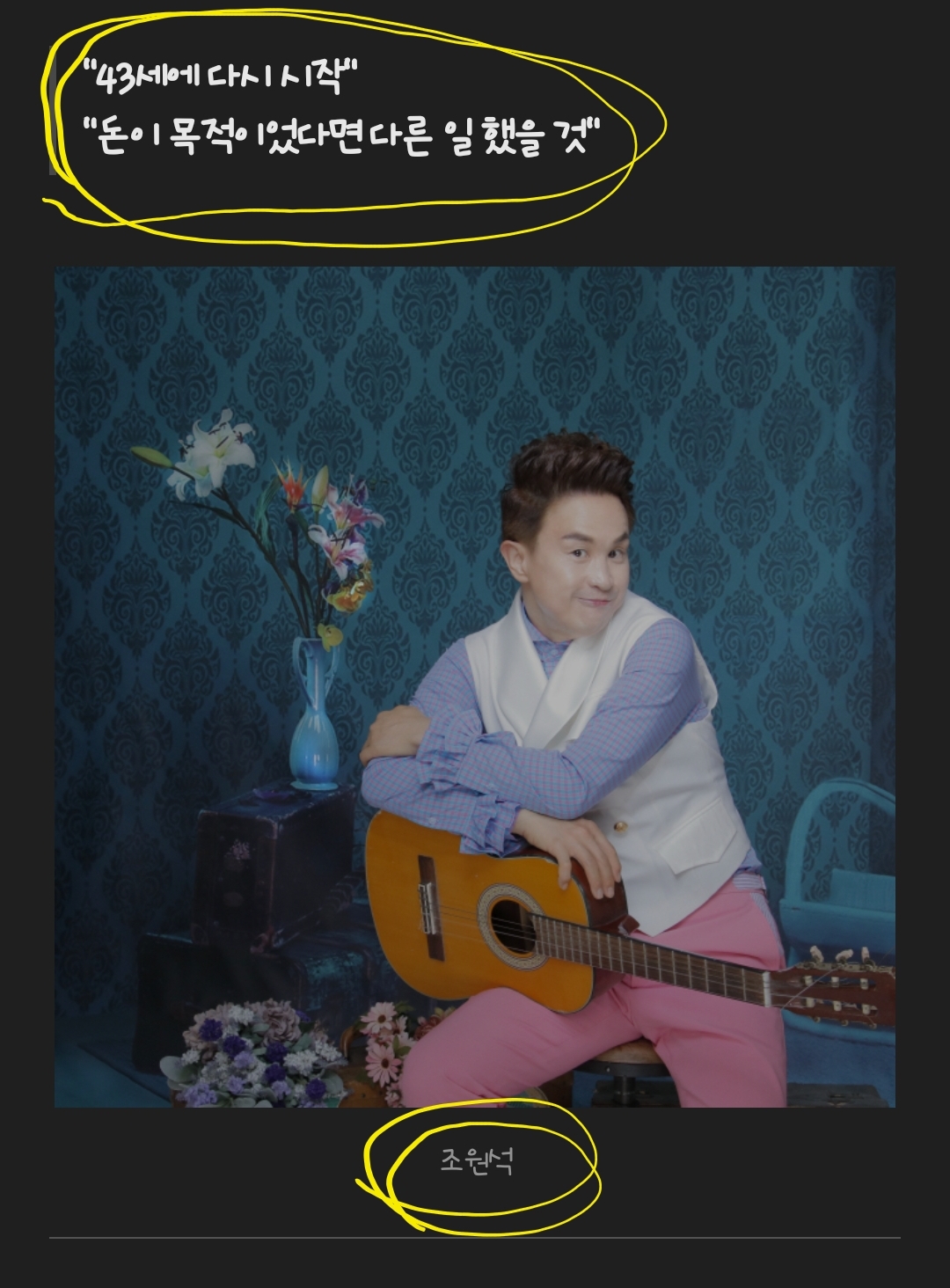 “성실함이 재능을 이긴다는 뒤늦은 깨달음을 얻은 마흔세살에 다시 시작합니다.”트롯 가수 활동에 나선 조원석이 신곡 ‘됐다 그래’가 타이틀곡인 두 번째 앨범 ‘어나더 뉴 스타트(Another ne