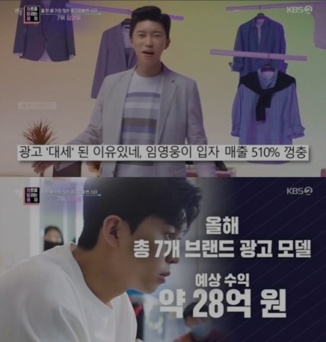 '연중 라이브' 가수 임영웅이 1년 광고 모델료 수익만 약 28억원을 번 것으로 알려졌다.19일 방송된 KBS2 예능프로그램 '연중 라이브'의 '차트를 달리는 여자'에서는 '2021년 가장 많은 광고료를 번
