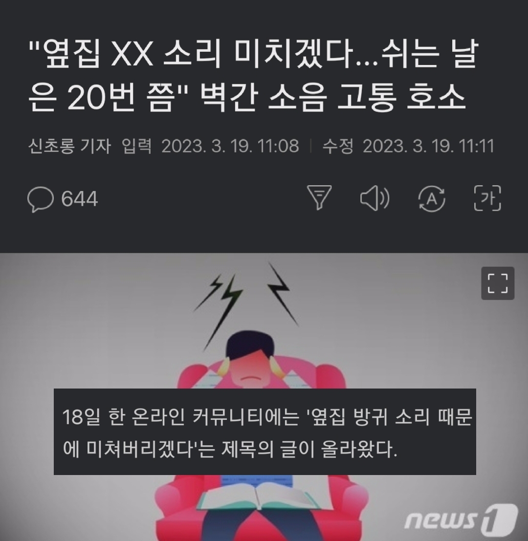 "옆집 XX 소리 미치겠다…쉬는 날은 20번 쯤" 벽간 소음 고통 호소 2023.03.19