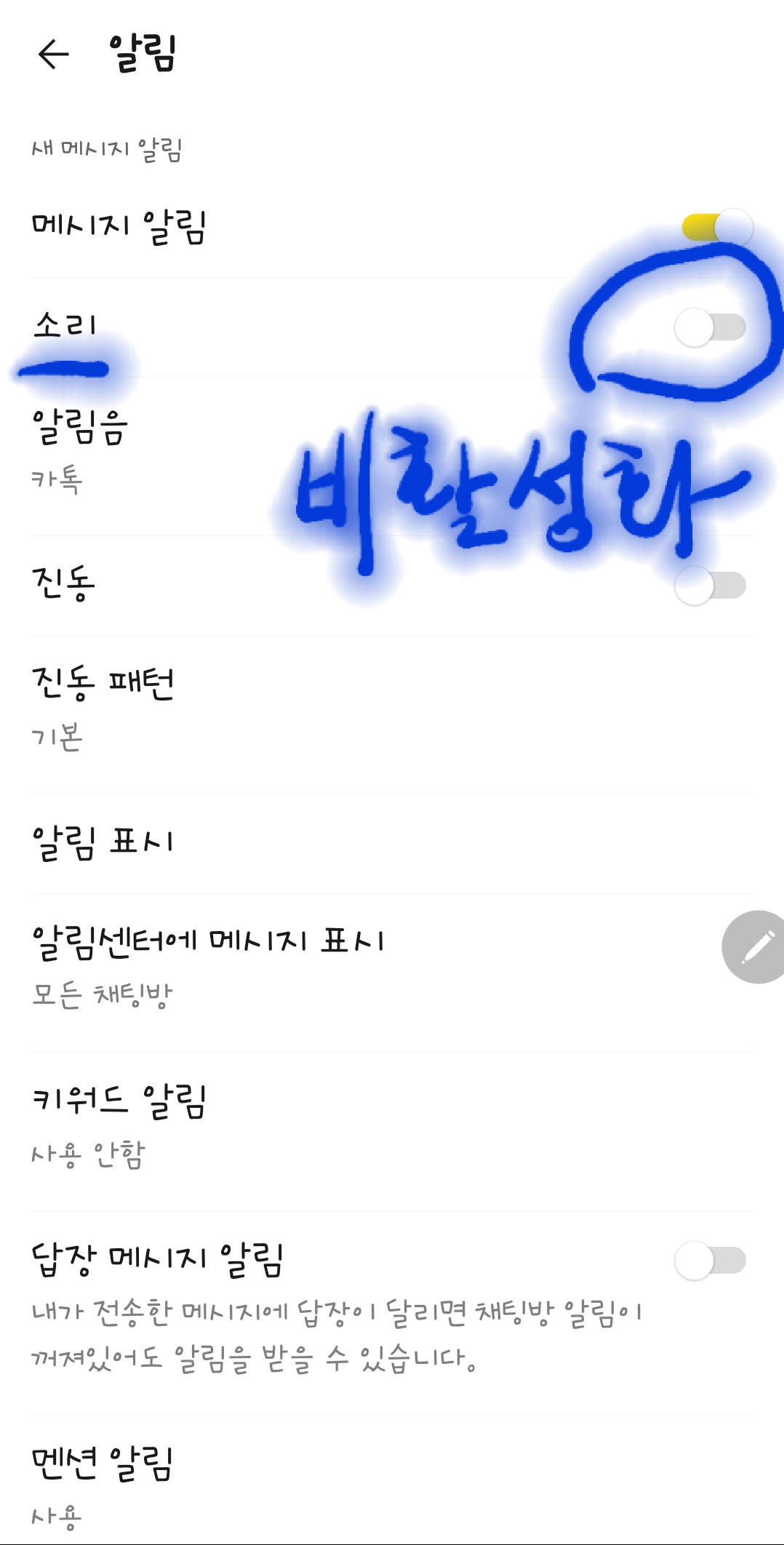 5. 제대로 조정이 끝나면 비활성화 되고, 더이상 카톡 소리도 울리지 않게 됩니다.