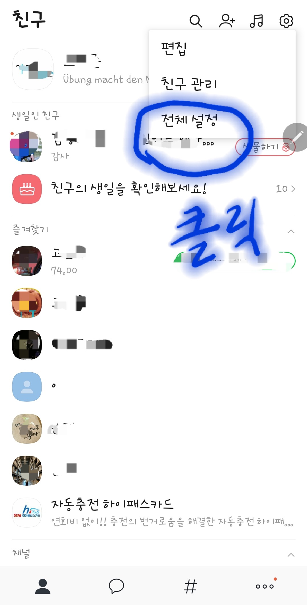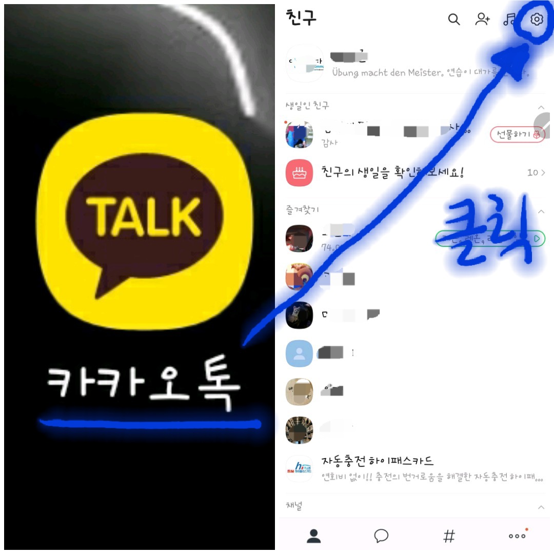 1. 먼저 카톡으로 들어가 기본화면 오른쪽 위의 《설정》 수레바퀴 모양을 눌러 줍니다.