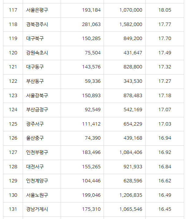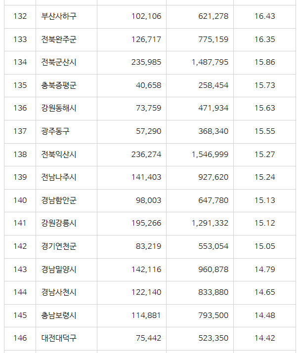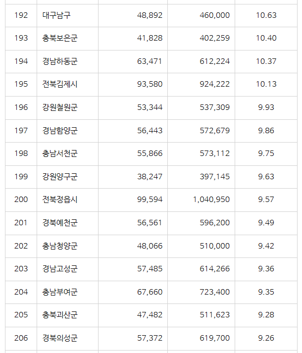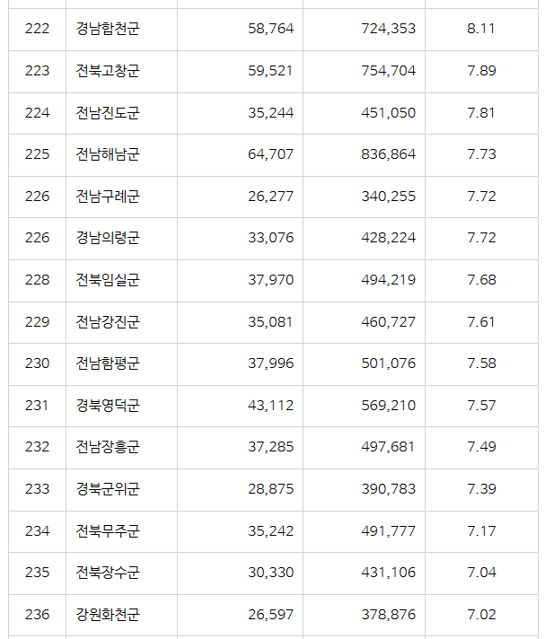 전국 243개 지자체의 순위이니 확인하시면 되겠습니다.