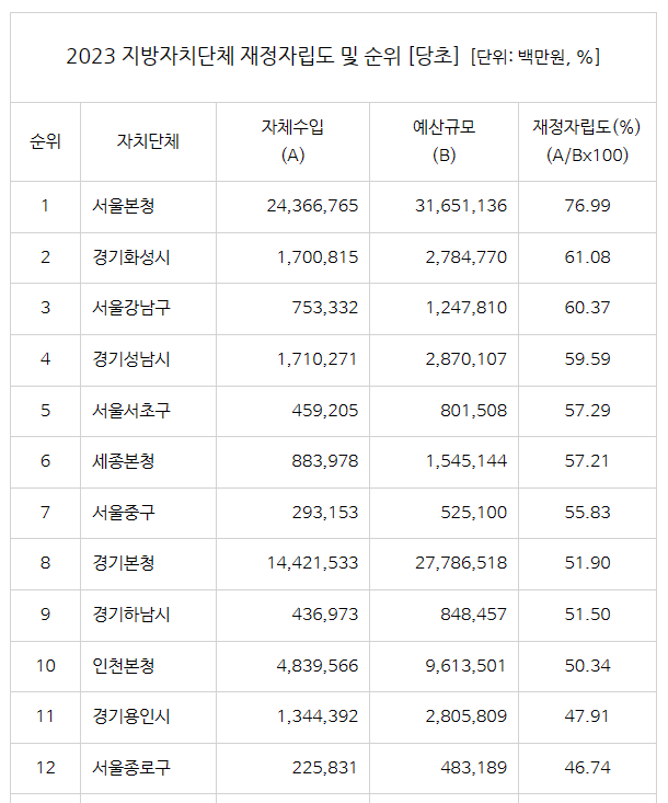 2023 지방자치단체 재정자립도 및 순위 [당초]