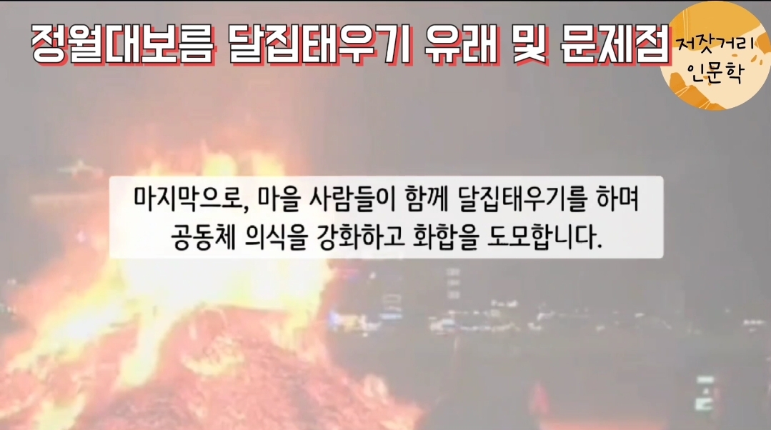 마지막으로, 마을 사람들이 함께 달집태우기를 하며 공동체 의식을 강화하고 화합을 도모합니다.