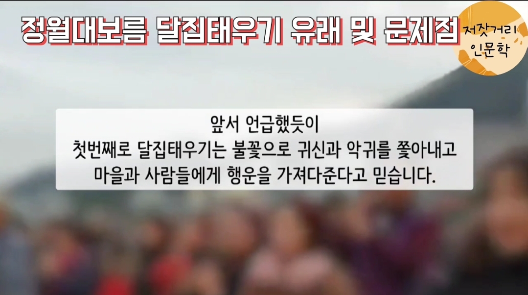 앞서 언급했듯이, 첫번째로 달집태우기는, 불꽃으로 귀신과 악귀를 쫓아내고 마을과 사람들에게 행운을 가져다준다고 믿습니다.