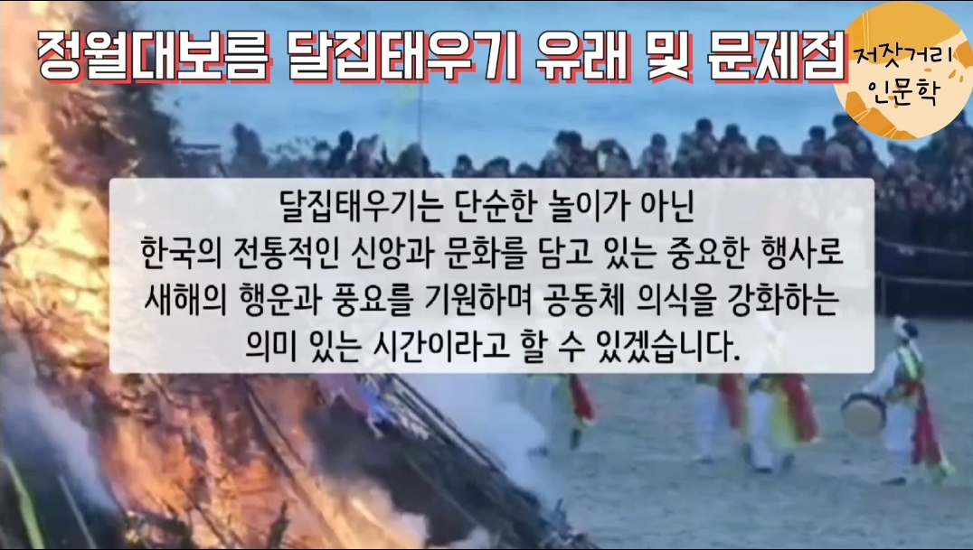 달집태우기는 단순한 놀이가 아닌, 한국의 전통적인 신앙과 문화를 담고 있는 중요한 행사로, 새해의 행운과 풍요를 기원하며 공동체 의식을 강화하는, 의미 있는 시간이라고 할 수 있겠습니다.