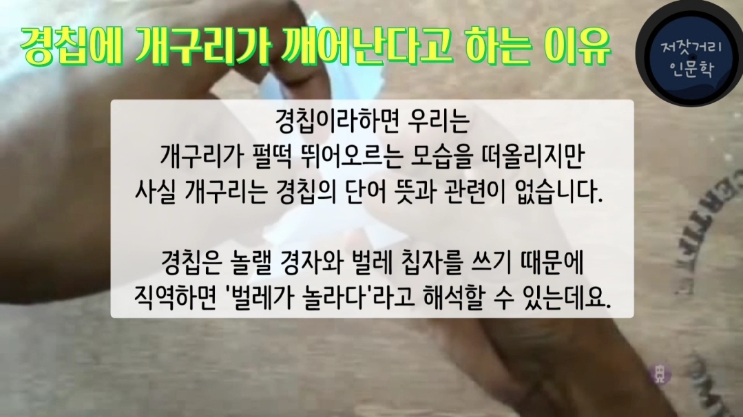 경칩이라하면 우리는 개구리가 펄떡 뛰어오르는 모습을 떠올리지만, 사실 개구리는 경칩의 단어 뜻과 관련이 없습니다. 경칩은 놀랠 경(驚)자와 벌레 칩(蟄)자를 쓰기 때문에 직역하면 '벌레가 놀라다'라고 해석할 수 있는데요.