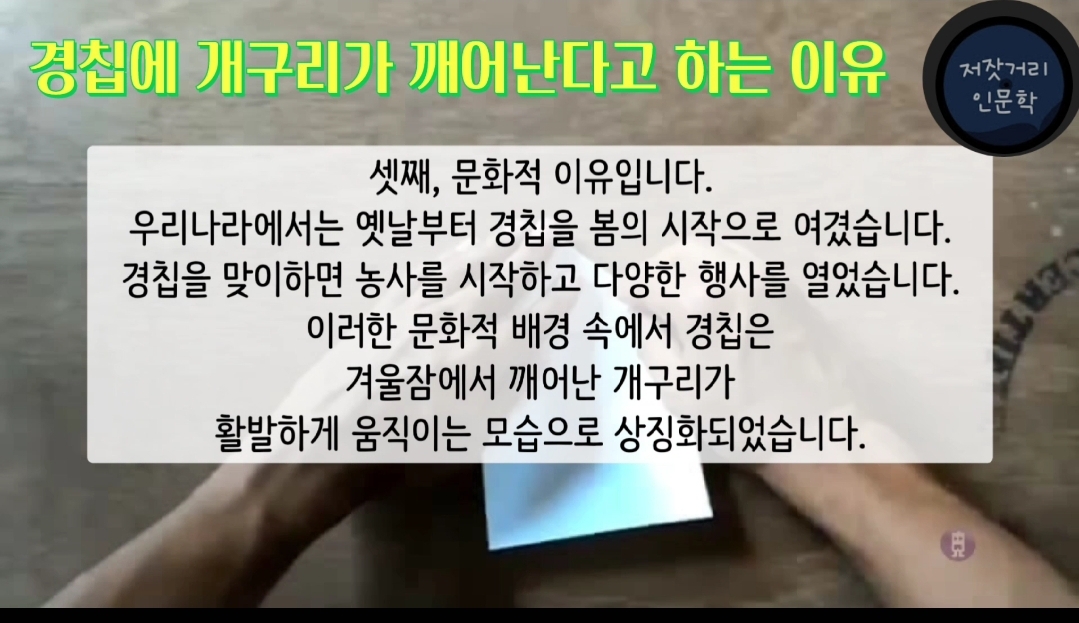 셋째, 문화적 이유입니다. 우리나라에서는 옛날부터 경칩을 봄의 시작으로 여겼습니다. 경칩을 맞이하면 농사를 시작하고 다양한 행사를 열었습니다. 이러한 문화적 배경 속에서 경칩은 겨울잠에서 깨어난 개구리가 활발하게 움직이는 모습으로 상징화되었습니다.