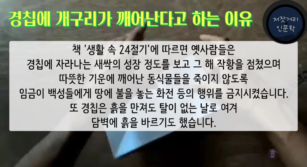 책 '생활 속 24절기'에 따르면, 옛사람들은 경칩에 자라나는 새싹의 성장 정도를 보고 그 해 작황을 점쳤으며, 따뜻한 기운에 깨어난 동식물들을 죽이지 않도록 임금이 백성들에게 땅에 불을 놓는 화전 등의 행위를 금지시켰습니다. 또 경칩은 흙을 만져도 탈이 없는 날로 여겨 담벽에 흙을 바르기도 했습니다.