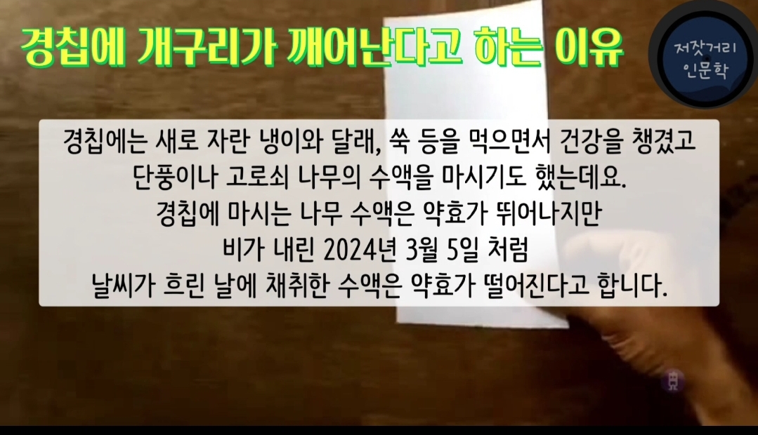 경칩에는 새로 자란 냉이와 달래, 쑥 등을 먹으면서 건강을 챙겼고, 단풍이나 고로쇠 나무의 수액을 마시기도 했는데요. 경칩에 마시는 나무 수액은 약효가 뛰어나지만, 비가 내린 2024년 3월 5일 처럼 날씨가 흐린 날에 채취한 수액은 약효가 떨어진다고 합니다.