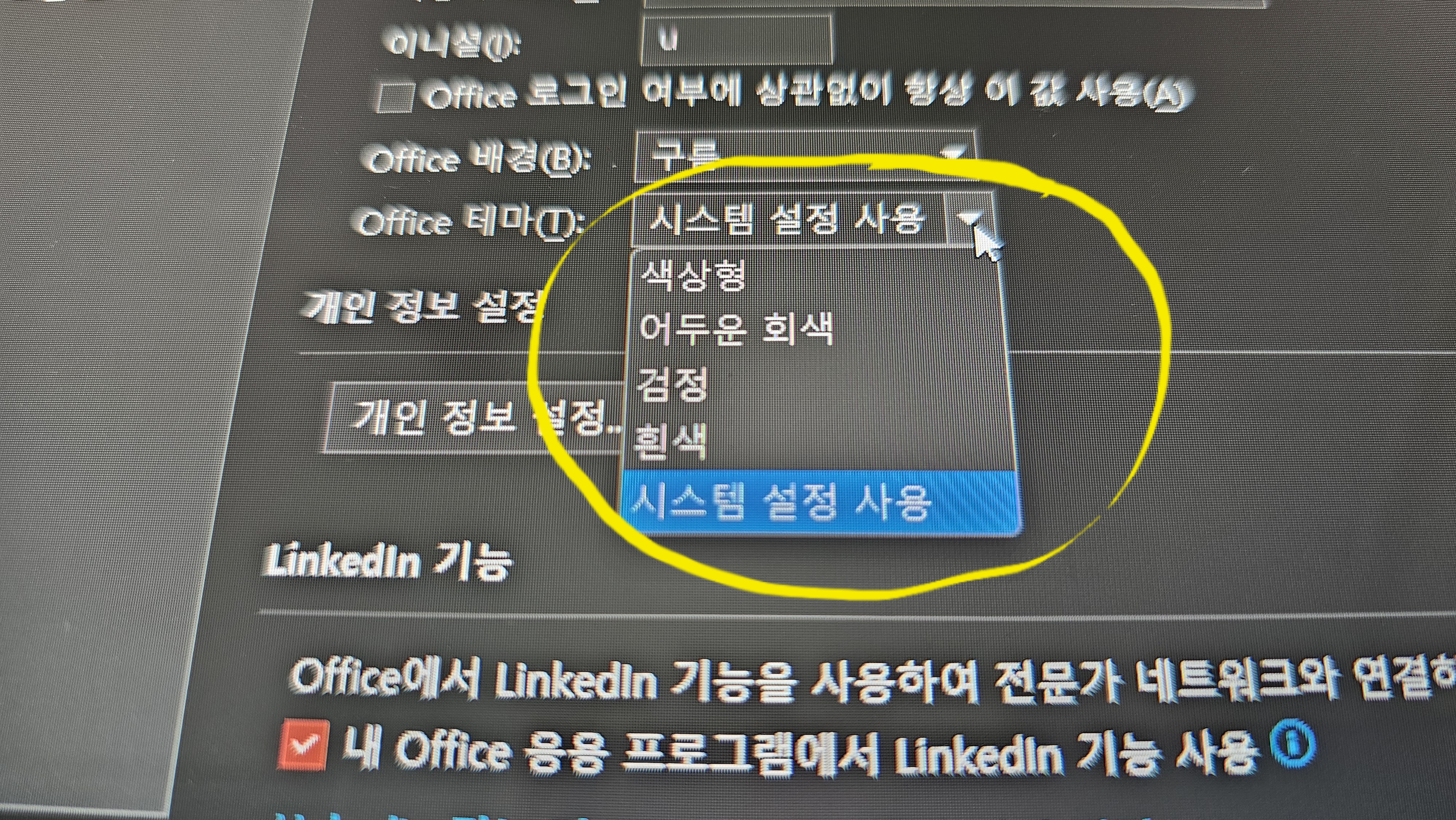 6. 오피스 테마 《시스템 설정 사용》 클릭