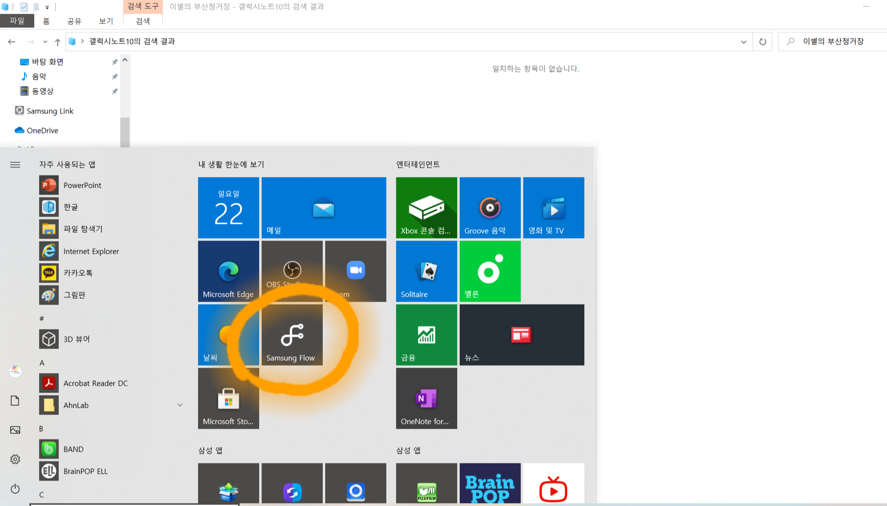 1. 갤럭시노트20 울트라에서 《삼성 플로우》를 찾아 줍니다. 저장되어 있는 위치를 알고 있으면 직접 선택하고, 모르는 경우라면 《검색창》을 이용합니다.