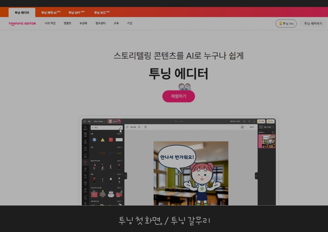 AI 웹툰 제작 도구 ‘투닝’을 사용하기 위해서선 홈페이지에 접속한 후(tooning.io) 회원가입을 해야 한다. 무료 요금제와 프로 요금제가 있으며, 교사는 프로 요금제를 평생 무료로 사용할 수 있다. 무료 요금제도 기본적인 작업 용도로는 사용할 수 있고, 투닝 GPT 5회, 투닝 보드 생성 무제한 이용이 가능하다.(기사中)