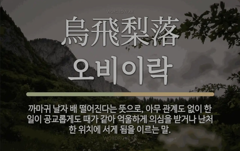 📌 오비이락(烏飛梨落)은 까마귀 날자 배 떨어진다는 뜻으로, 아무 관계도 없이 한 일이 공교롭게도 때가 같아 억울하게 의심을 받거나 난처한 위치에 서게 됨을 이르는 말입니다.