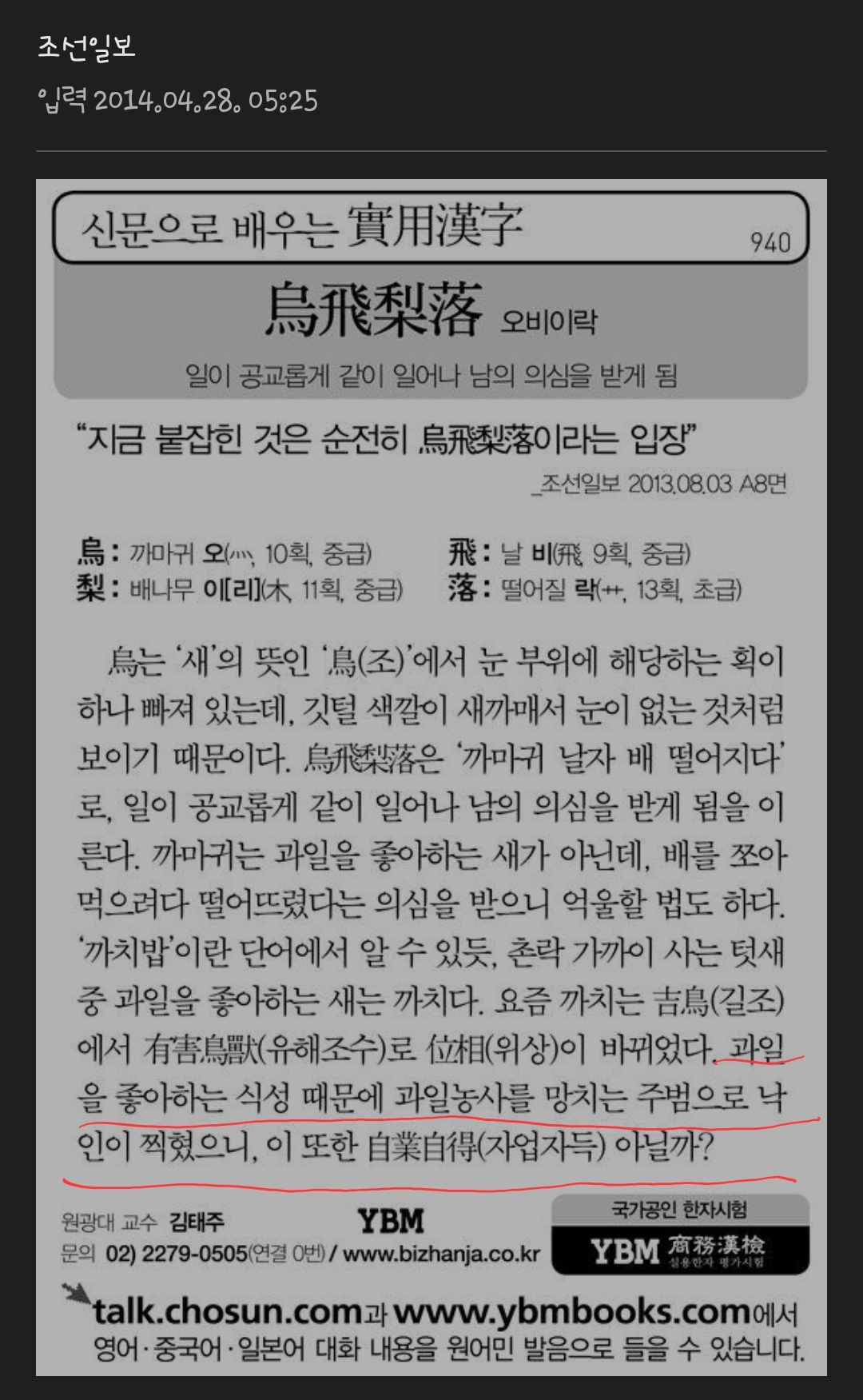 [신문으로 배우는 실용한자] 오비이락(烏飛梨落) 2014.04.28