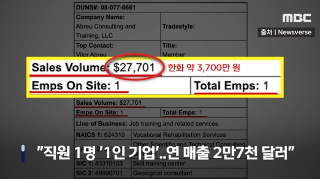 또 미국 인구조사국에 등록된 기업정보에 따르면 직원은 아부레우 박사 단 1명이며 연평균 매출도 2만 7천 달러, 우리 돈 약 3,700만 원에 그친다는 보도도 나왔습니다.