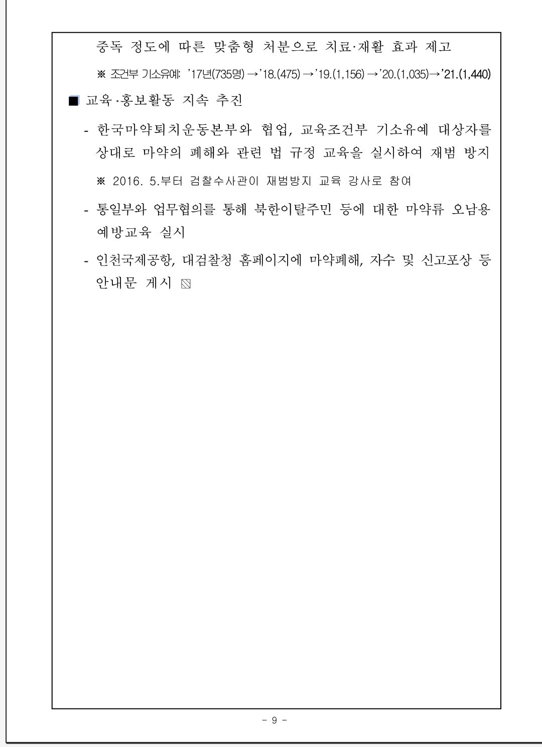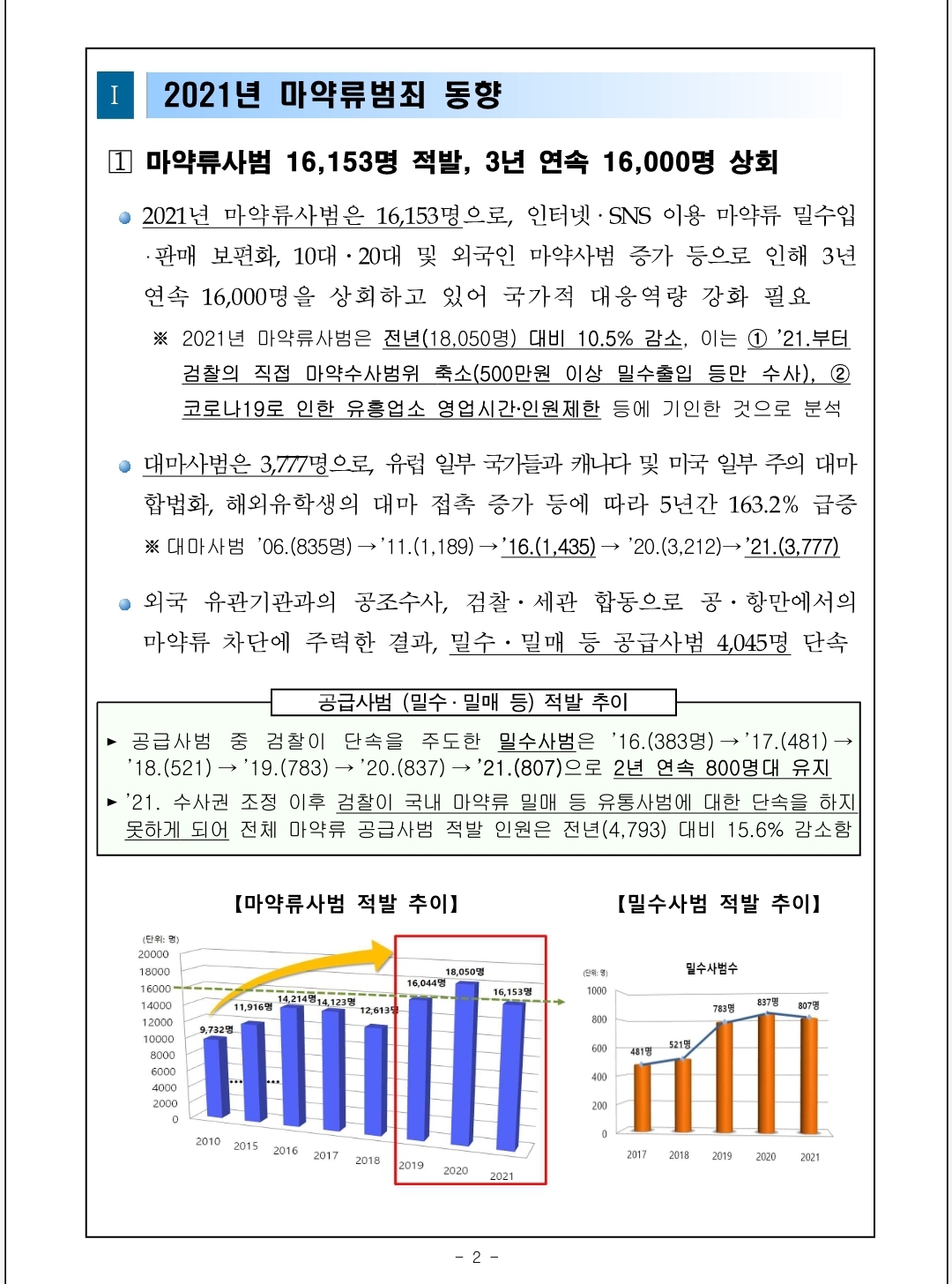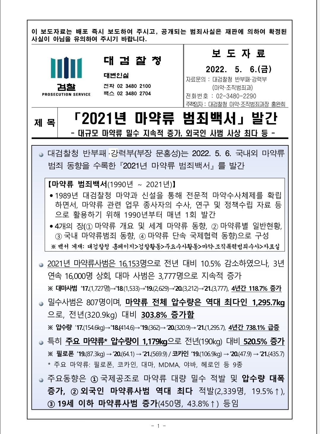 지난해 '2021년 마약류 범죄백서'를 발간하면서 "청소년·마약류사범의 특성, 예방교육·치료재활 현황과 문제점 등 정책연구자료를 식품의약품안전처, 교육부 등과 공유해 향후 정책수립에 반영하겠다"고 밝힌 바 있다.(기사中)