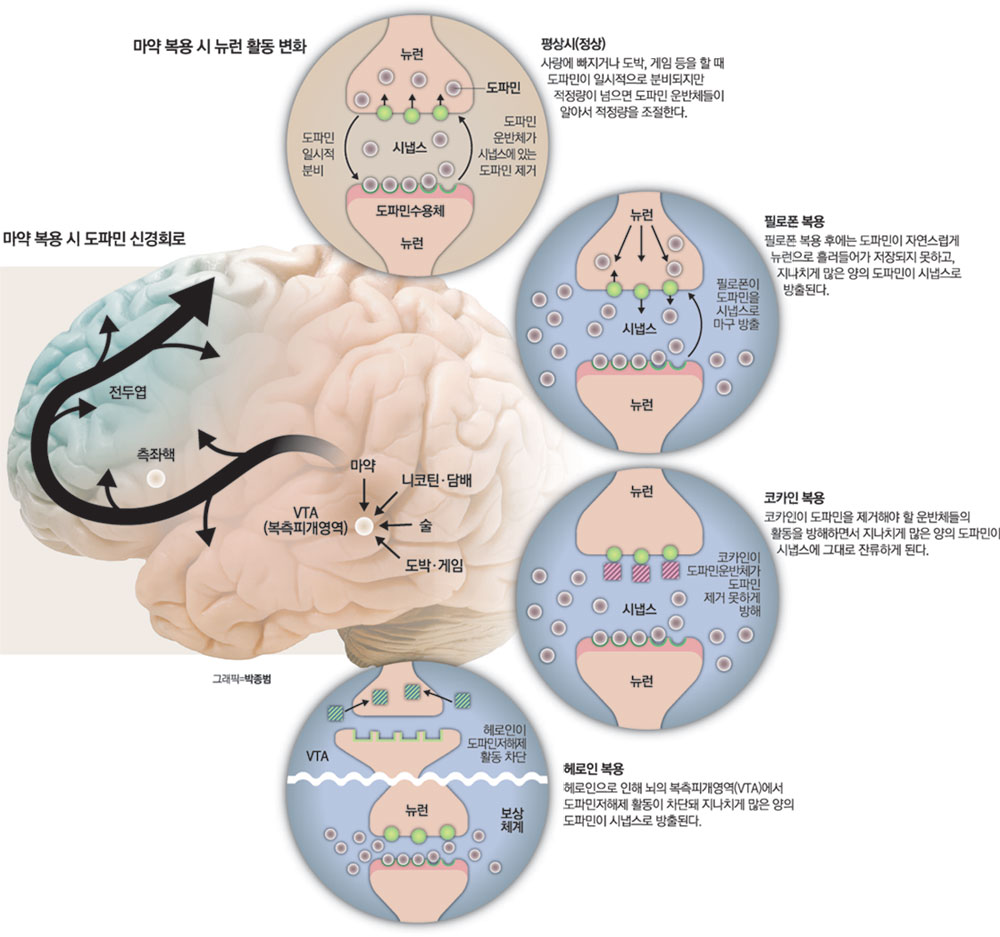 문제는 마약을 했을 때 뇌에서 분비되는 도파민이 지나치게 많아진다는 점이다. 이 때문에 뇌의 피질에서 선조체로 도파민 등의 신경 정보가 전달되는 '쾌감 회로(보상 회로)'가 왜곡되기 시작한다.