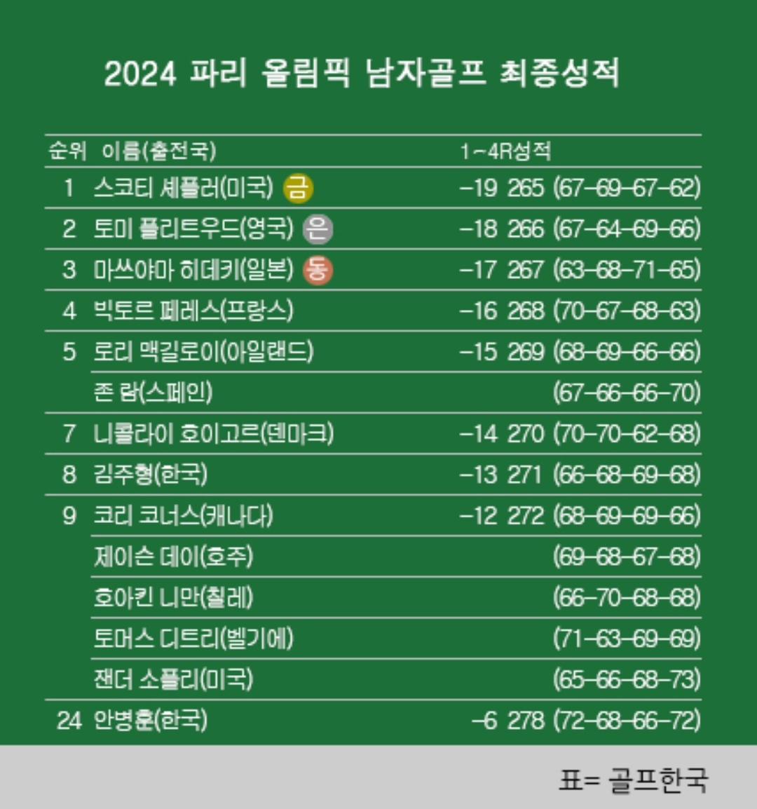 《2024 파리 올림픽 남자골프 최종순위》