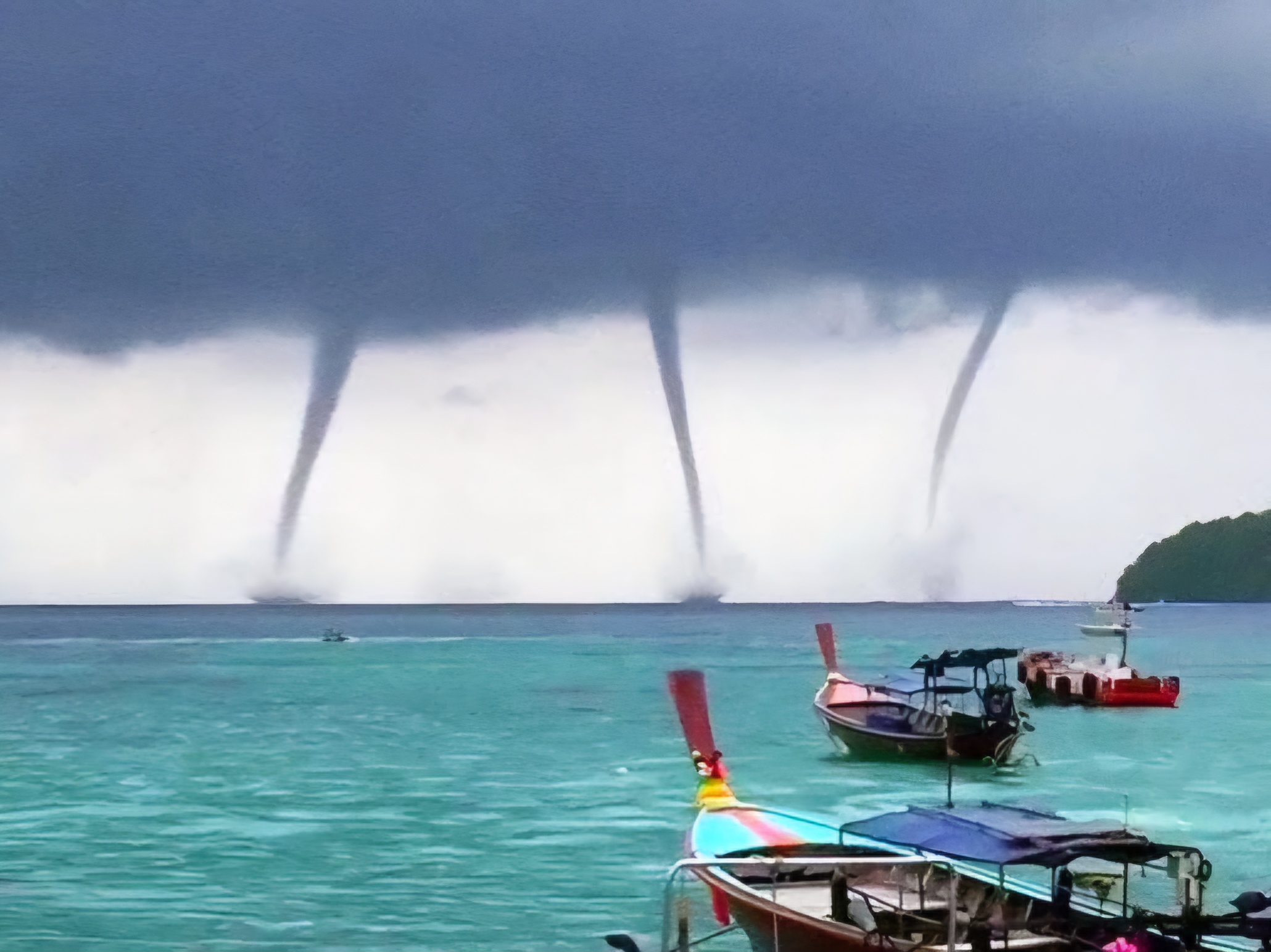 📍 워터스파우트 : 주로 해상에서 발생하는 용오름입니다. 토네이도에 비해 일반적으로 약하지만, 항해하는 선박이나 해안가에 피해를 줄 수 있습니다. 해수면 위에 깔대기 모양의 구름이 발생하고, 바닷물이 함께 회전하는 모습을 볼 수 있습니다.
