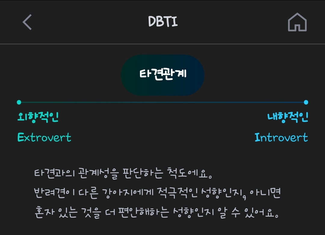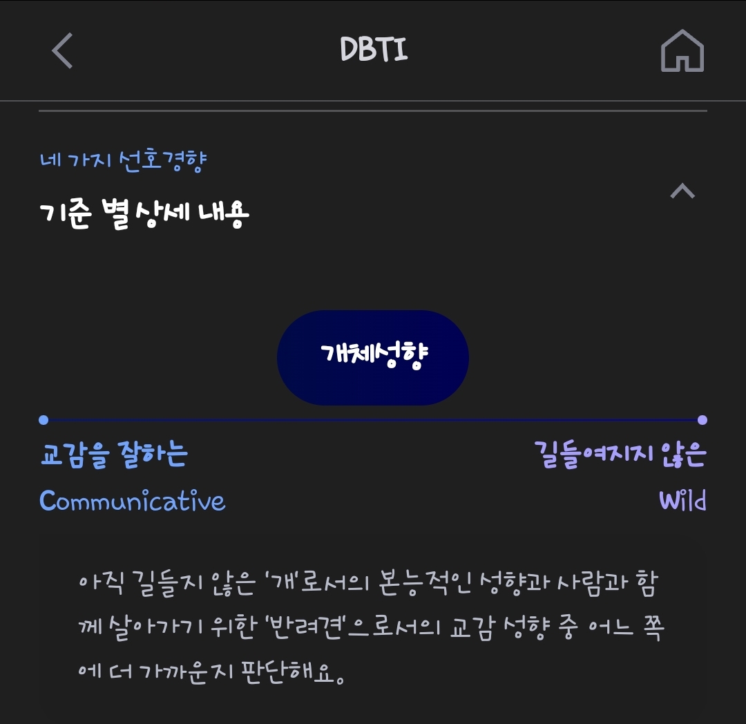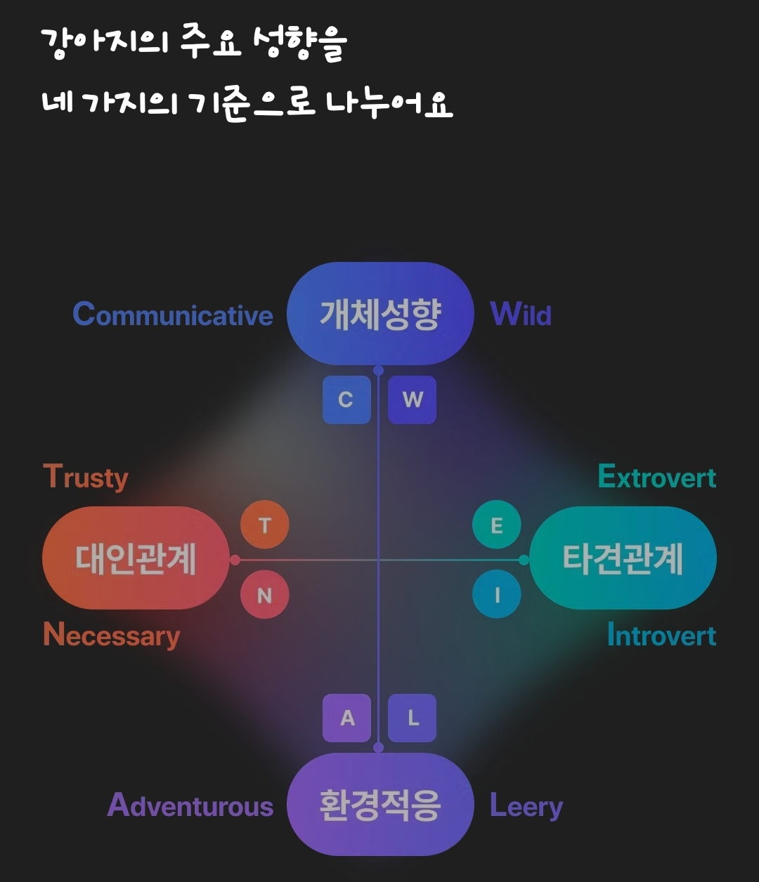 앱에 들어가니 강아지의 주요성향을 4가지로 분류해 놓고, 기준별 상세내용을 2개씩 추가해 놓았다는 걸 알 수 있습니다.