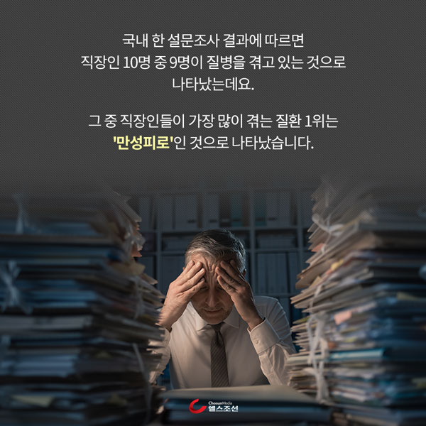 카드뉴스 [카드뉴스] 쉬어도 쉬어도 풀리지 않는 '피로' 우리가 피곤한 이유 5가지 이현정 헬스조선 기자 입력 2018/08/08 11:26 국내 한 설문조사 결과에 따르면 직장인 10명 중 9명이 질병을 겪고 있