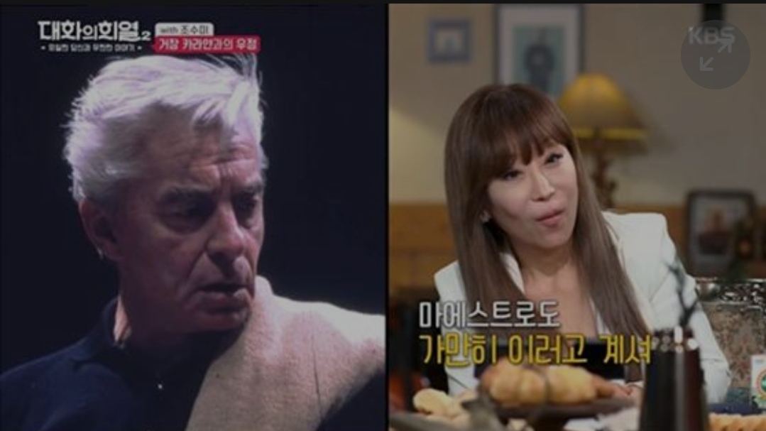 조수미는 “내 방 벽에 카라얀 판넬이 있었다. 아침에 일어나면 ‘굿모닝 마에스트로’라고 인사했다”며 “당시 무대에서 노래를 하는데 다리가 다 떨리더라”고 했다. 이어 “노래를 끝내고 카라얀 선생님을 만나러 갔는데 매일 보던 사람 얼굴이더라. 선생님께 '머리카락을 만져 봐도 되느냐'고 묻기도 했다”며 당시를 회상했다.