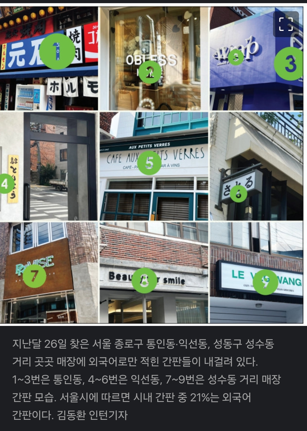 서울시 기준 간판 10개 중 2개 이상이 외국어만으로 표시된 것이다. 이처럼 난립하는 외국어 간판의 가장 큰 문제는 읽기 어렵다는 점이다.